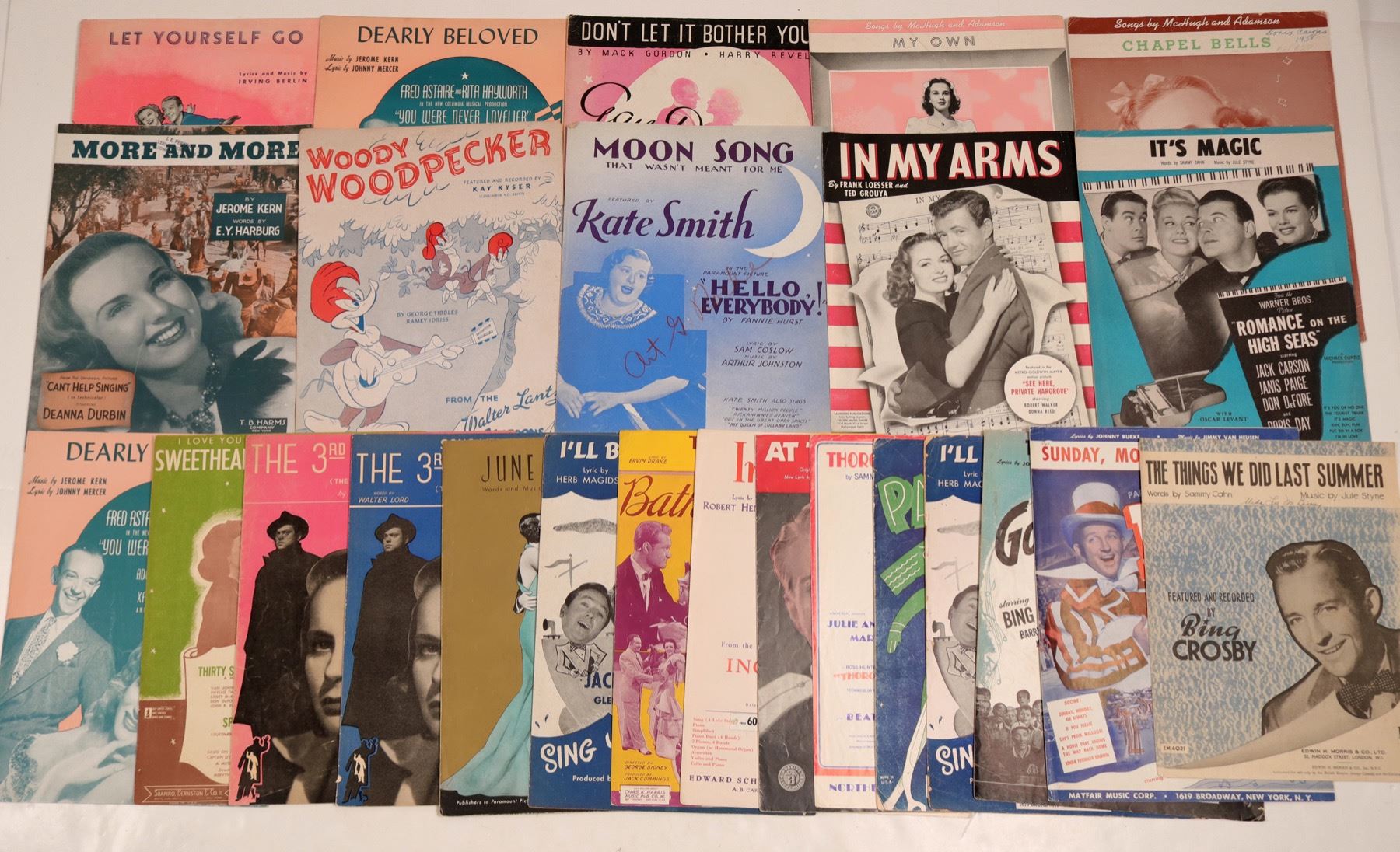 Twenty four pieces of nostalgic sheet music from the movies. Big names include: Fred Astaire & Ginger Rogers, Rita Hayworth, Deanna Durbin, Kate Smith, Woody Woodpecker, Bing Crosby, Robert Walker, Donna Reed, Dorothy Lamour, Red Skelton and Esther Williams are all represented. City: State: Date: