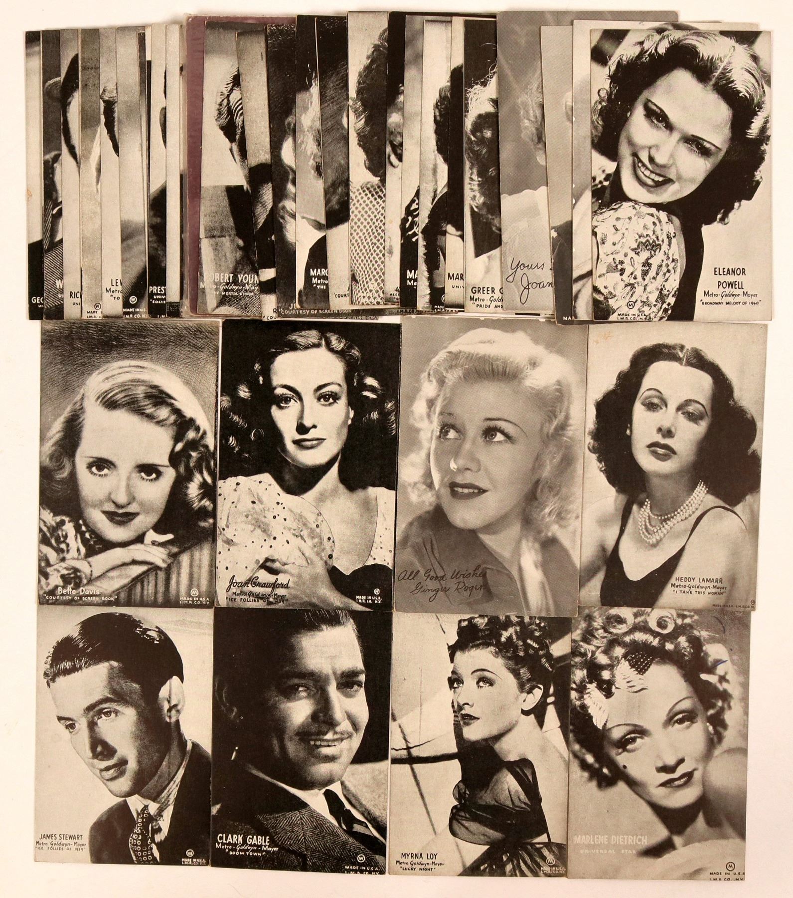 Large lot of postcards featuring Old Hollywood stars. Notable stars featured include James Stewart, Clark Gable, Myrna Loy, Marlene Dietrich, Joan Crawford, Bette Davis, Ginger Rogers, and Heddy Lamarr. See photos for more.