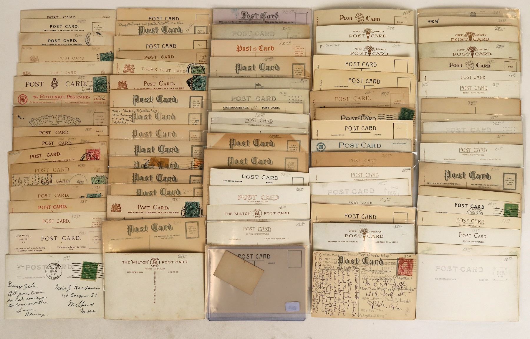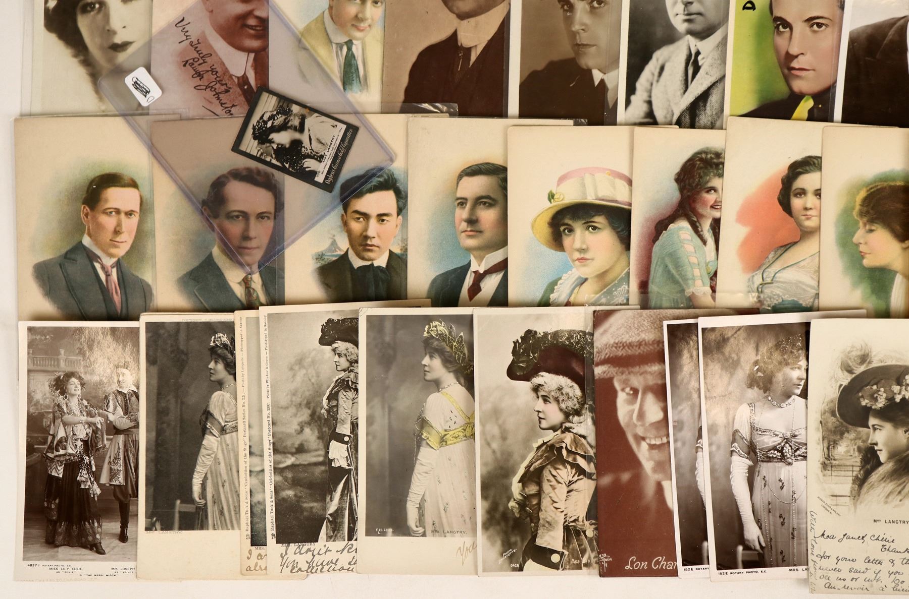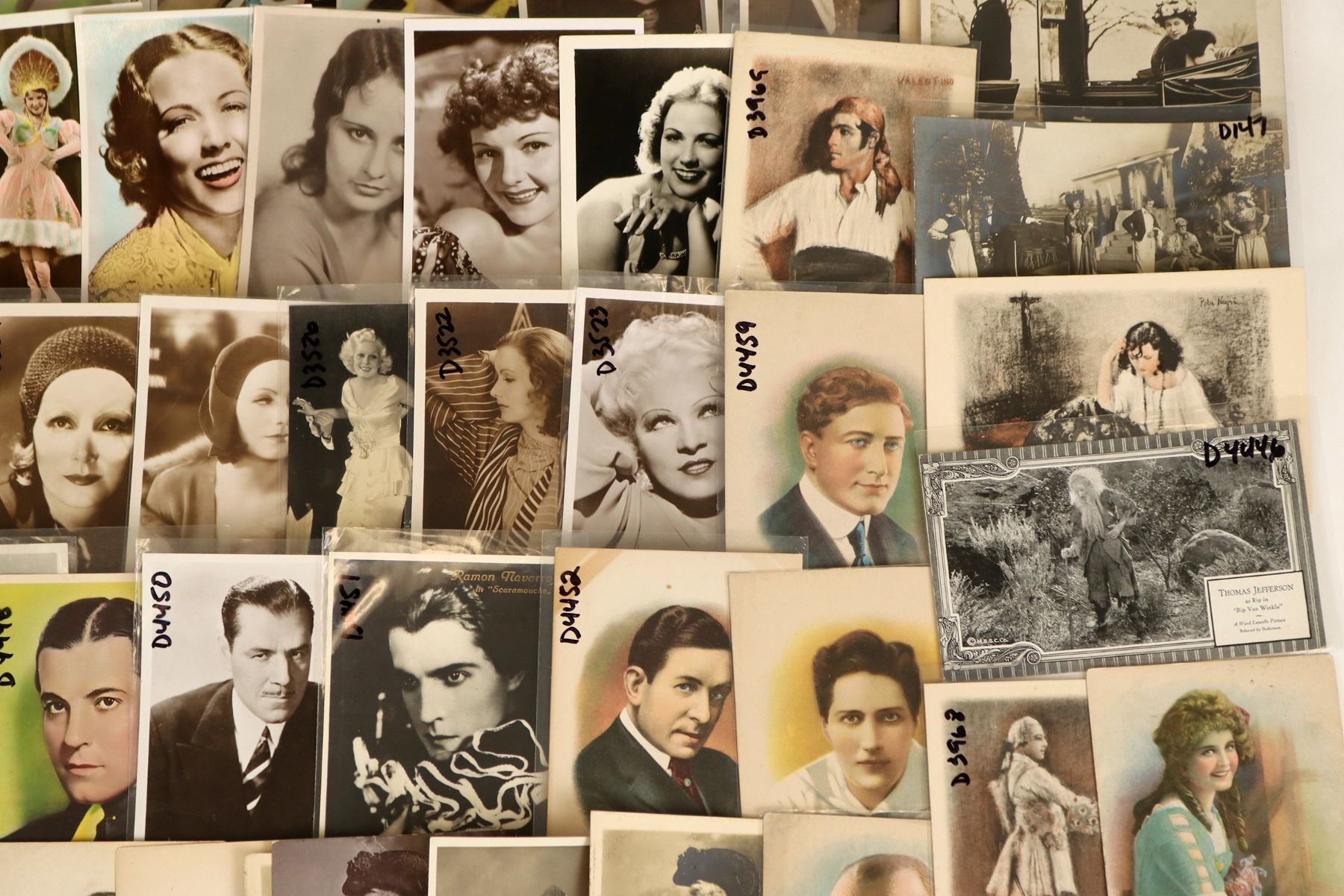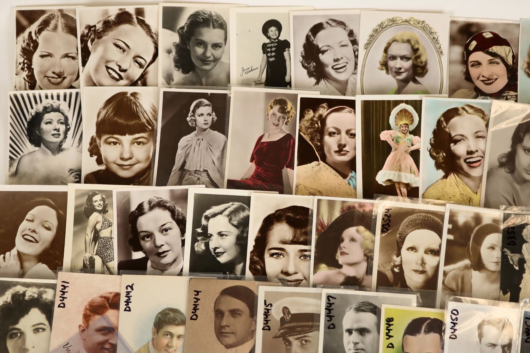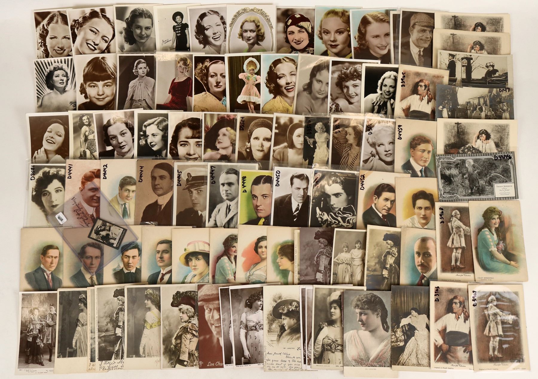 About 75 Hollywood actress & actor postcards, mostly RPC's. Lon Chaney, Barbara Stanwyck, Helen Hayes, Joan Crawford, Greta Garbo, Jack Holt, Rudolph Valentino etc. Nice mix from the golden age of Hollywood. [Hollywood California