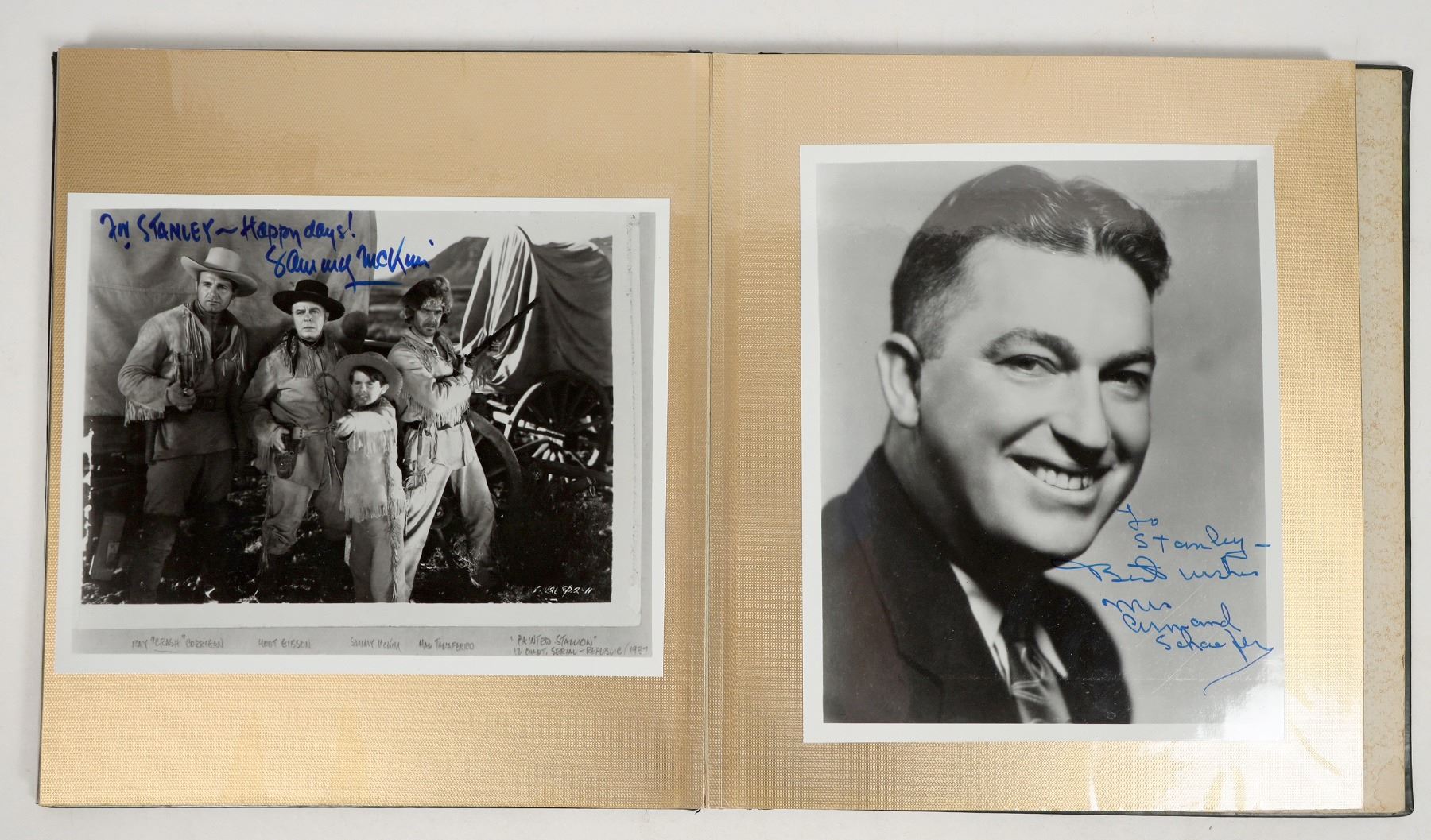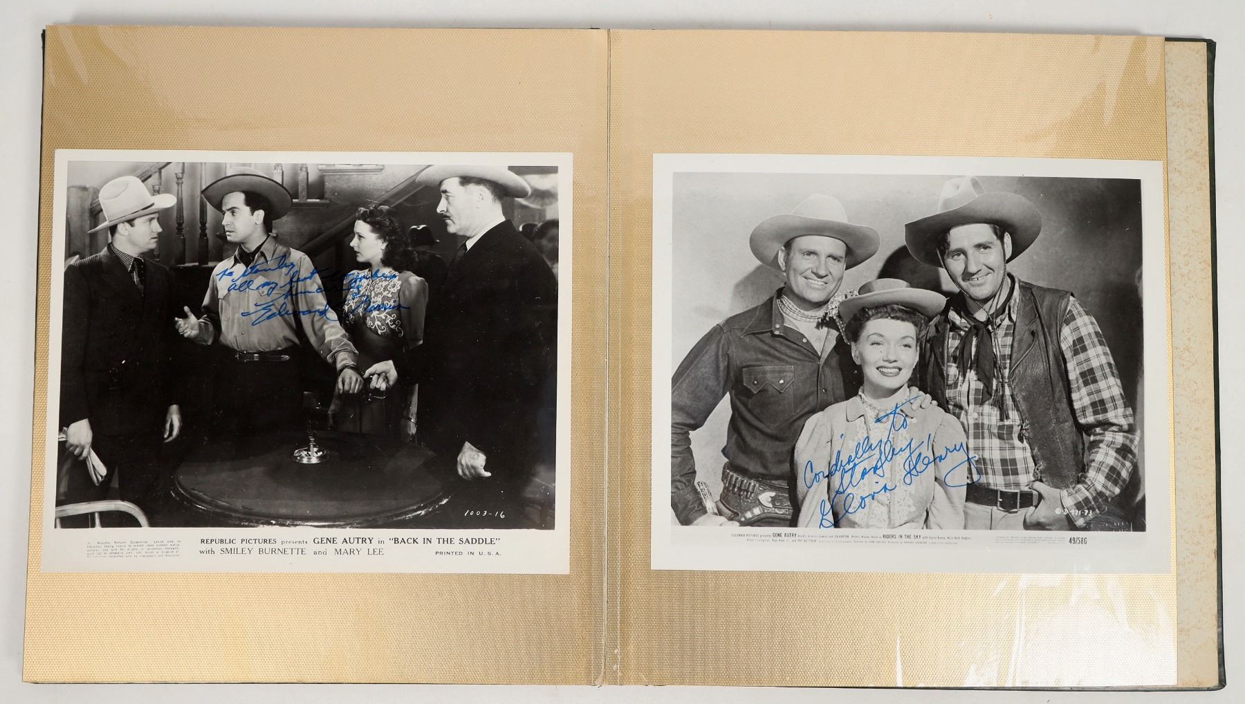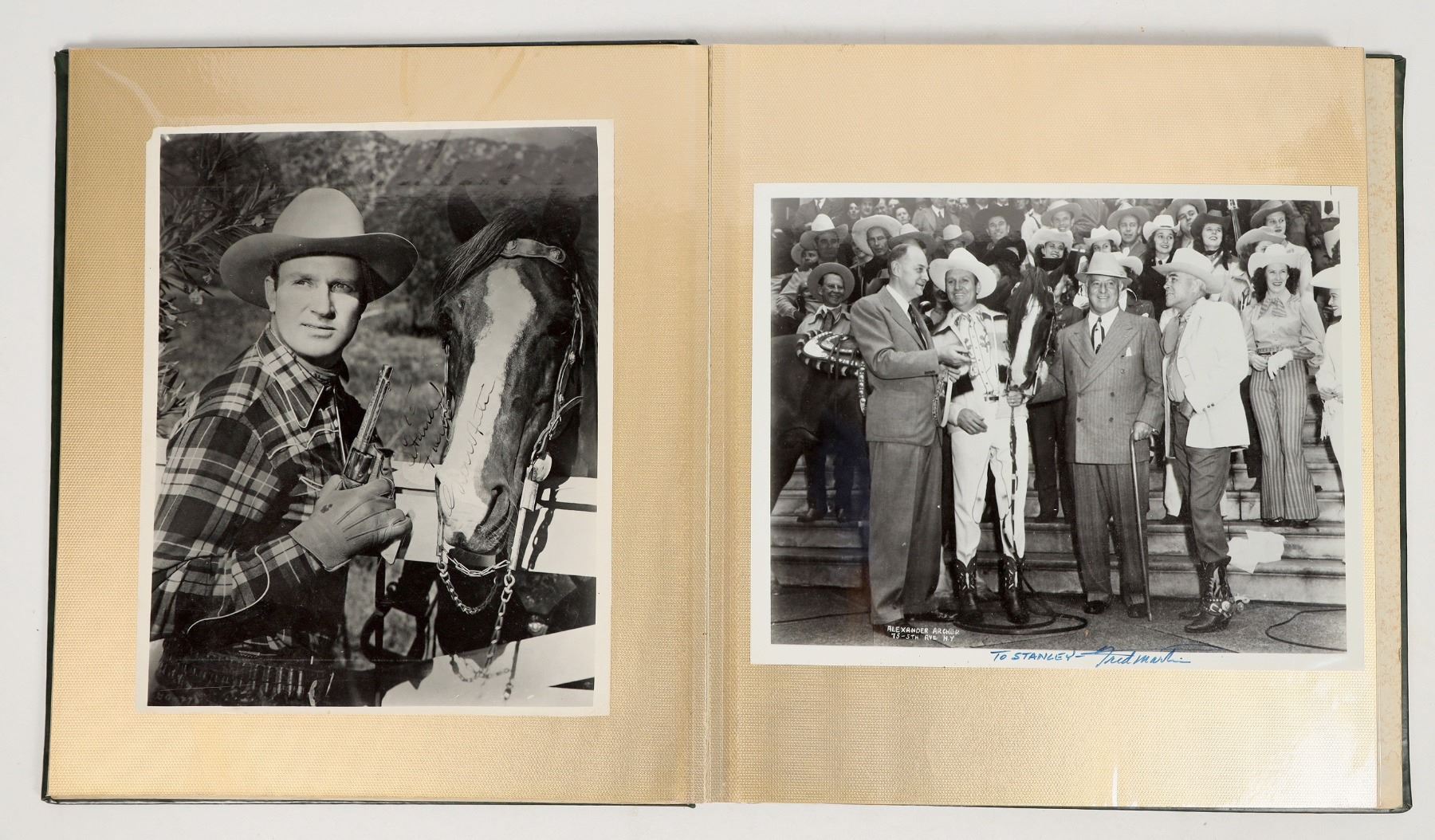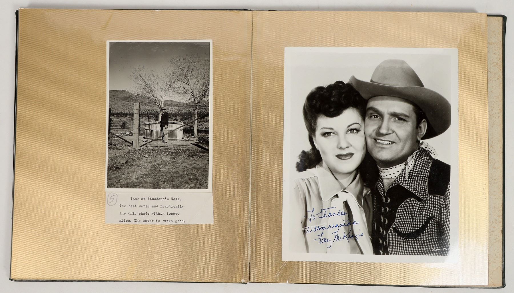 Scrapbook with 16 signed photos. All autographs are made out to Stanley. Western actors that signed are: Gene Autry, Fred Martin, Fay McKenzie, Sammy McKim, Conrad Schaefer, Edward Norris, Gloria Henry (multiple), Peggy Stewart, Kim Maynard, Bob Steele, Manny Wakely, and more. Photos are mostly movie or headshots, 8 x 10". Also includes a photo of a man standing at the tank at Stoddard's Well.