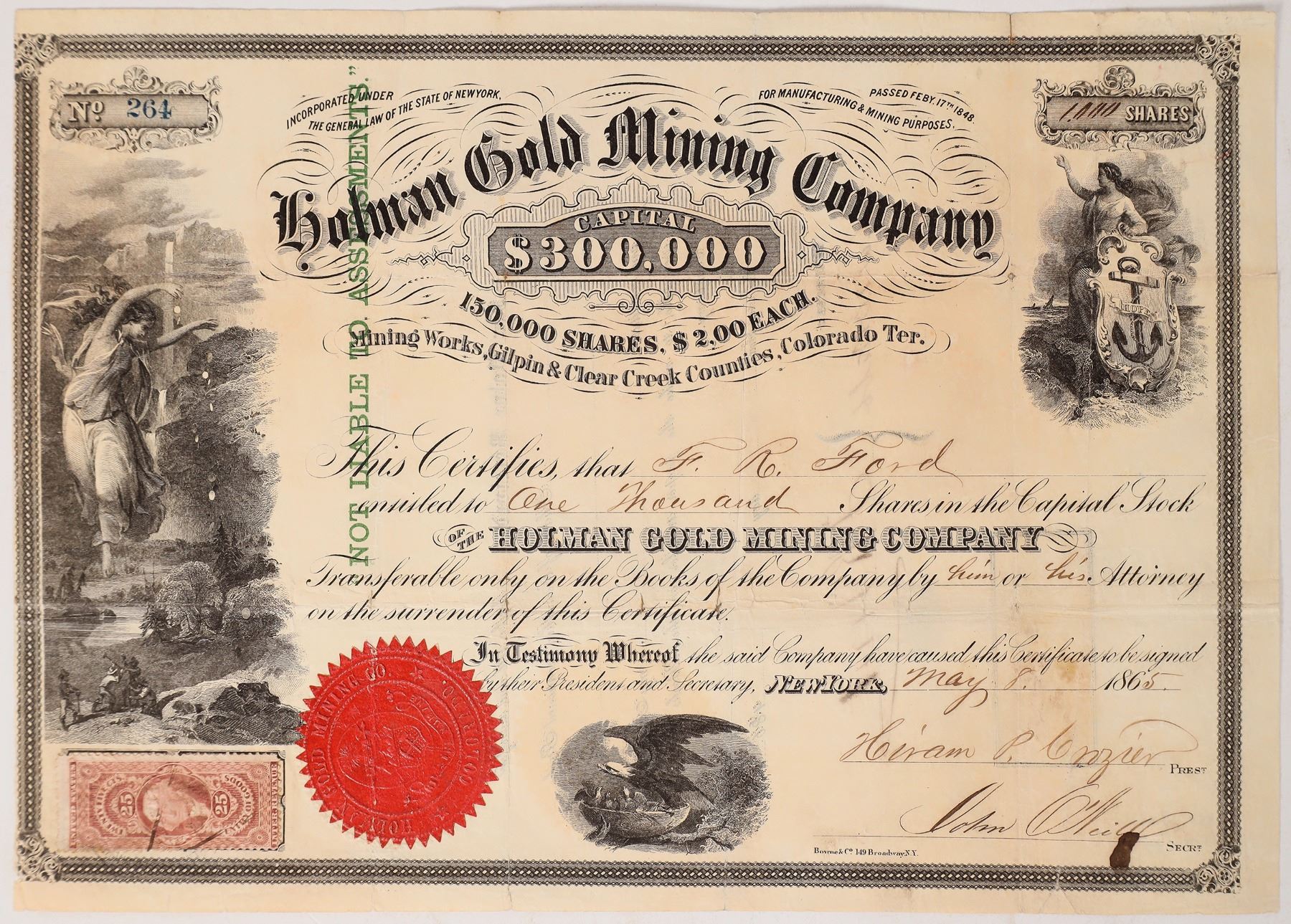 Holman Gold Mining Company stock certificate No. 264, incorporated February 17, 1848 in New York. For mining works, Gilpin and Clear Creek Counties, Colorado Ter.. Issued to F.R. Ford for 1000 shares in New York on May 8, 1865. Signed by Hiram P. Crozier(?) (president) and John O'Neill (secretary). Printer: Bowne & Co 149 Broadway NY. 29x20.2cm. Black on white. Red seal. Revenue stamp bottom left. 3 vignettes: Greek goddess of gold droping coins across mountain landscape with workers on hill (left), bald eagle perched at nest and feeding young (bottom center), Greek figure standing tall with arm outstretched, bracing a shield with an anchor with the word "Hope". Very finely detailed vignettes.