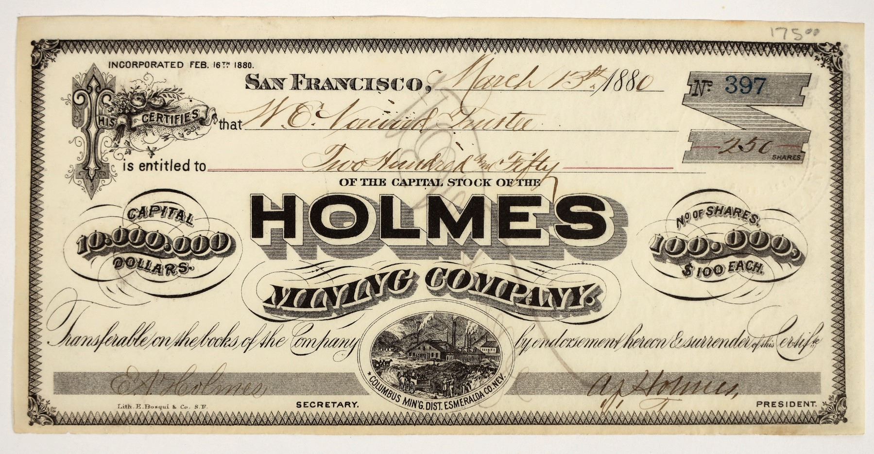 "Columbus Min'g Distr. Esmeralda Co. Nev." printed at bottom center. No. 397, issued for 250 shares to WE Norwood in 1880 in San Francisco. Signed by president AJ Holmes and secretary EA Holmes. Not cancelled. Mining vignette. Candelaria. In 1883 the Holmes made big news when they were involved in a major lawsuit with the Northern Belle. In 1886 they declared their first dividend and at least three more. In 1887 the mine and mill was closed through February.