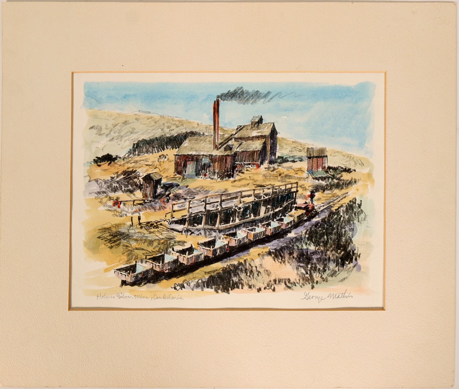 Nice original watercolor of Holmes Silver Mine in Candelaria, NV. Ore cars in a row and smelter, signed by George Mathis. 9.25x10.25" plus mat.