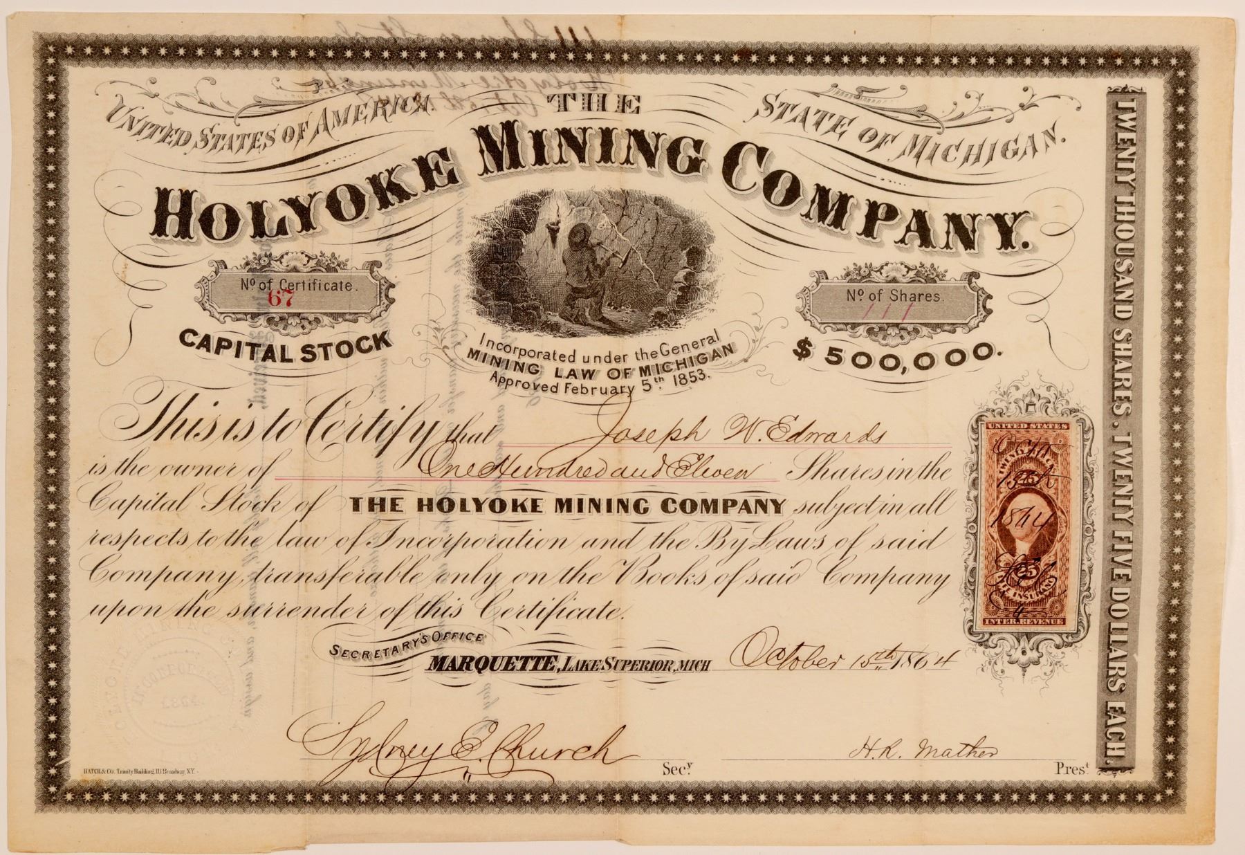 # 67 for 111 shares to Joseph Edwards. Signed by Sydney Church and president HR Mather. Dateline Marquette, Lake Superior, Michigan, October 15, 1864. (Rare reference to Lake Superior on a mining stock cert.) 25c Life Insurance revenue stamp. Not cancelled. Underground mining vignette. Cut unevenly on bottom. Top left corner fold. Nicer Michigan Stock Certificate! City: State: Michigan Date: 1864