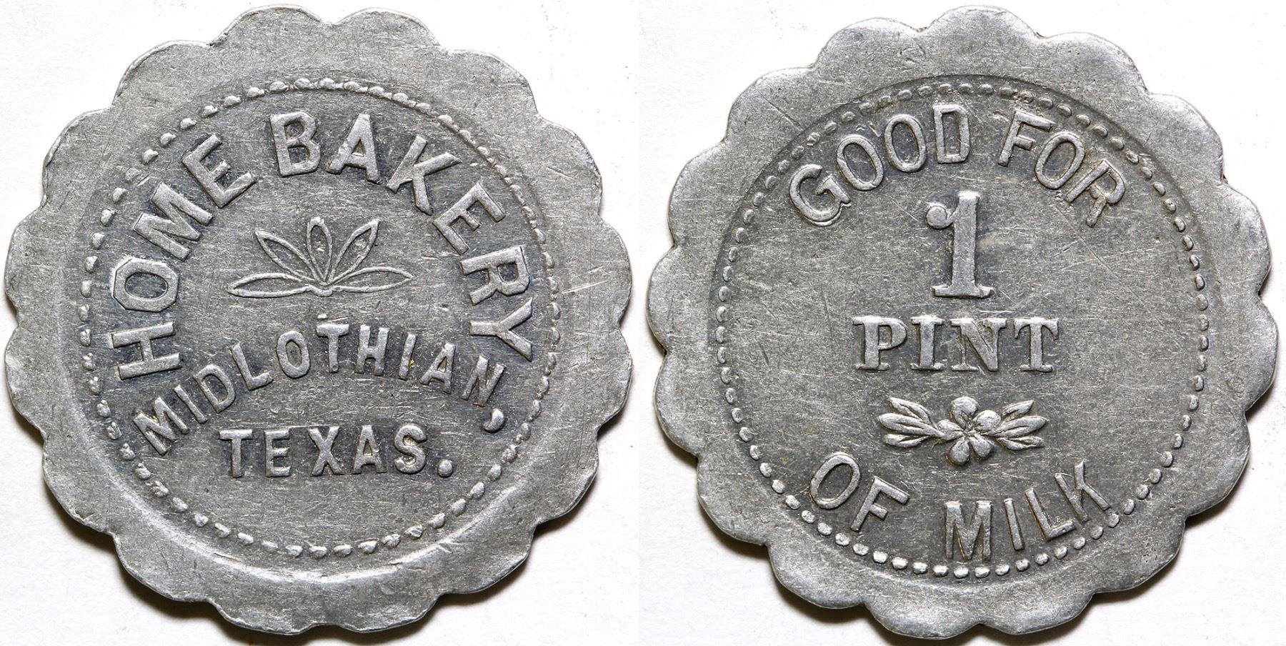 Rare, beautiful condition, aluminum 16 scalloped 30mm, HOME BAKERY/ MIDLOTHIAN/TEXAS.//GF/1/PINT/OF MILK. HWAC# 62500 Date: Location: Midlothian, Texas