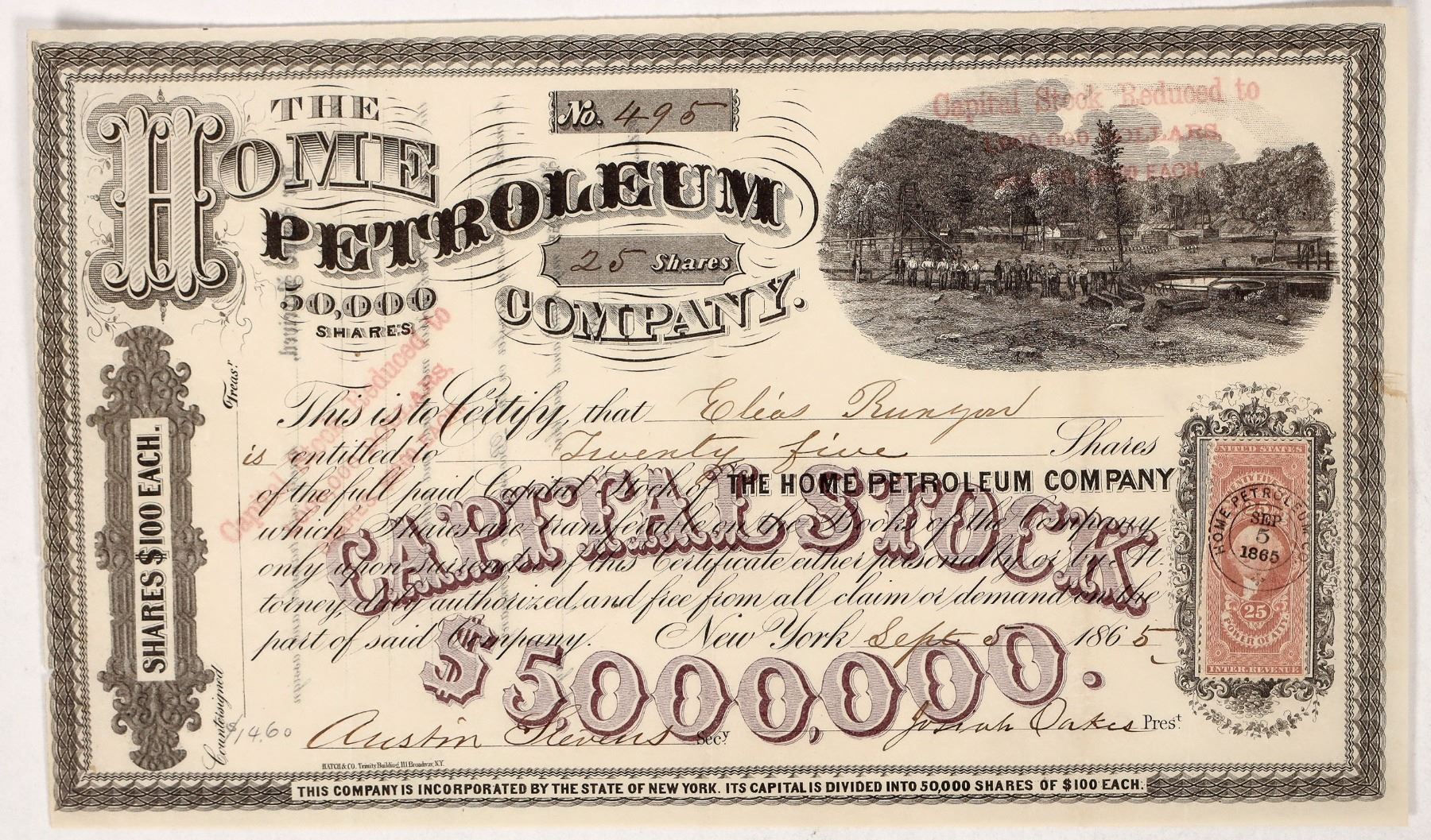 #495 for 25 shares to Elias Bunyon. Signed by president Oakes and secretary Stevens. Underprint purple Capital Stock $500,000. Stamp upper right and lower left about stock reduction. Rather unique oil camp (not field) vignette. Hatch of New York printer. 25c Power of Atty revenue stamp.