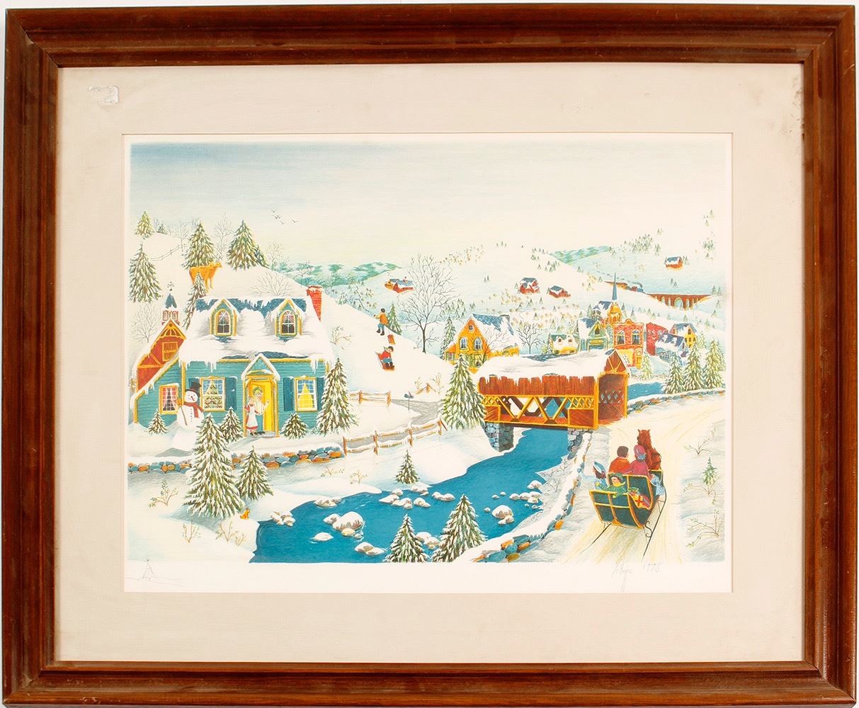 "Home for the Holidays" original lithograph by Robert LoGrippo, created for Franklin Gallery. Color lithograph of an outdoor winter scene. 13" x 17.75". Framed and matted 21.5" x 25.5". Date: 1978 Location: HWAC# 56807