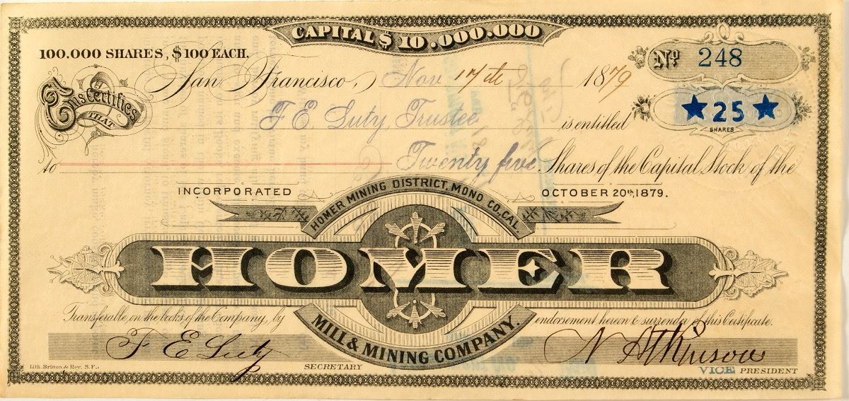 #248 for 25 shares to F Luty trustee in 1879. Issued 27 days after incorporation. Signed by Luty as secreatry and vice president Atkinson. Excellent condition. Two paid assessments. The Homer was the largest mine in the Homer district. It produced about $650,000 in gold through 1881, according to Burchard. Located about 2 miles from the May Lundy near Lundy Lake. L. L. Homer discovered the district in August, 1879. It is near Lundy, about 22 miles southwest of Bodie The first discoveries in the district were in Mill canyon, 1.5 miles from Lundy. J. G. McClinton, of Bodie, bought the first discovered ledge from Homer and incorporated the company. Martin Jones was the superintendent. Several other companies were incorporated about the same time, including the May Lundy, Homer Land, Water, Mining, and Mill Co. A fairly detailed description is given in Burchard, 1880. City: Mono County State: California Date: 1879 hwac# 35624