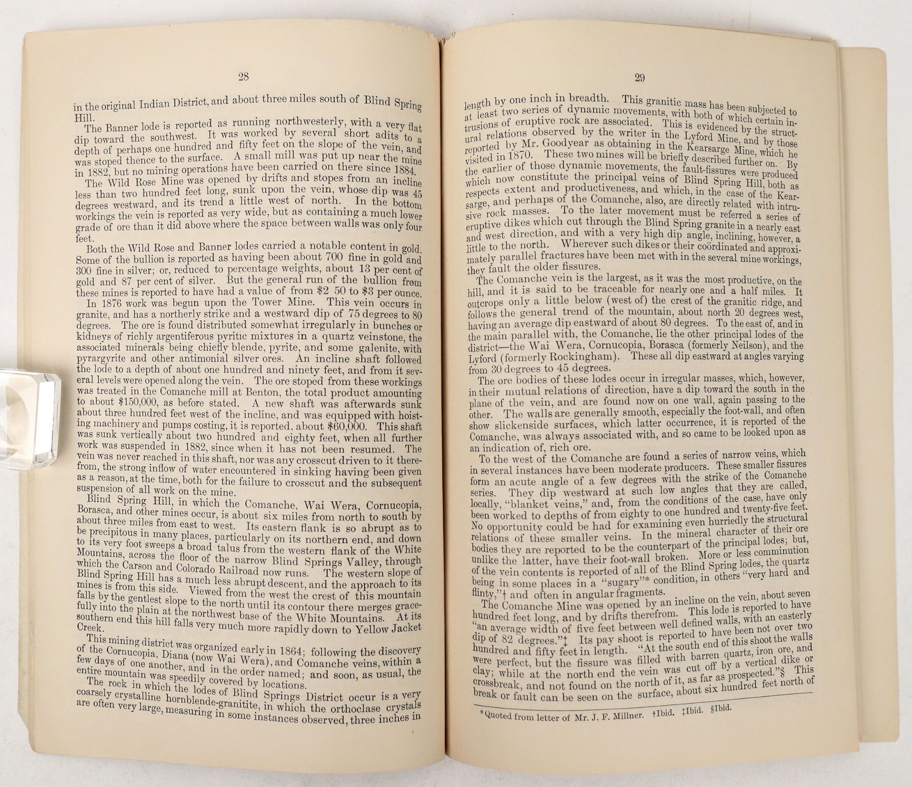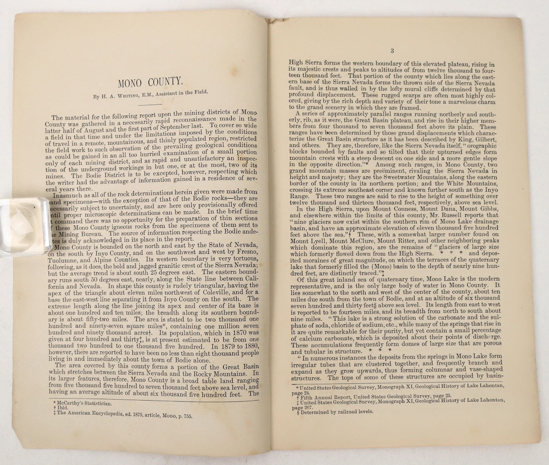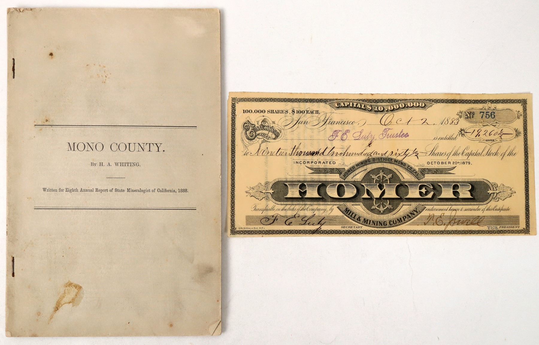 A stock certificate for 19.260 shares in the Homer Mill & Mining Company, made out in 1883 to F.E. Luty, the secretary of the company. No. 756 issued. Signed by Luty himself as well as the company's vice president. Great condition, some toning, minor wear/staining at edges. The lot also contains an 1888 report on the minerals of Mono County by H.A. Whiting; good condition, 49 pages, contains a fold-out map of a Bodie mine.