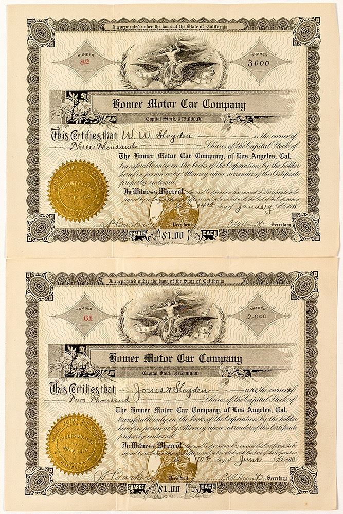 Two stock certificates from the Homer Motor Car Company of Los Angeles dates 1910 and 1911. City: Los Angeles State: California Date: ID# 40550