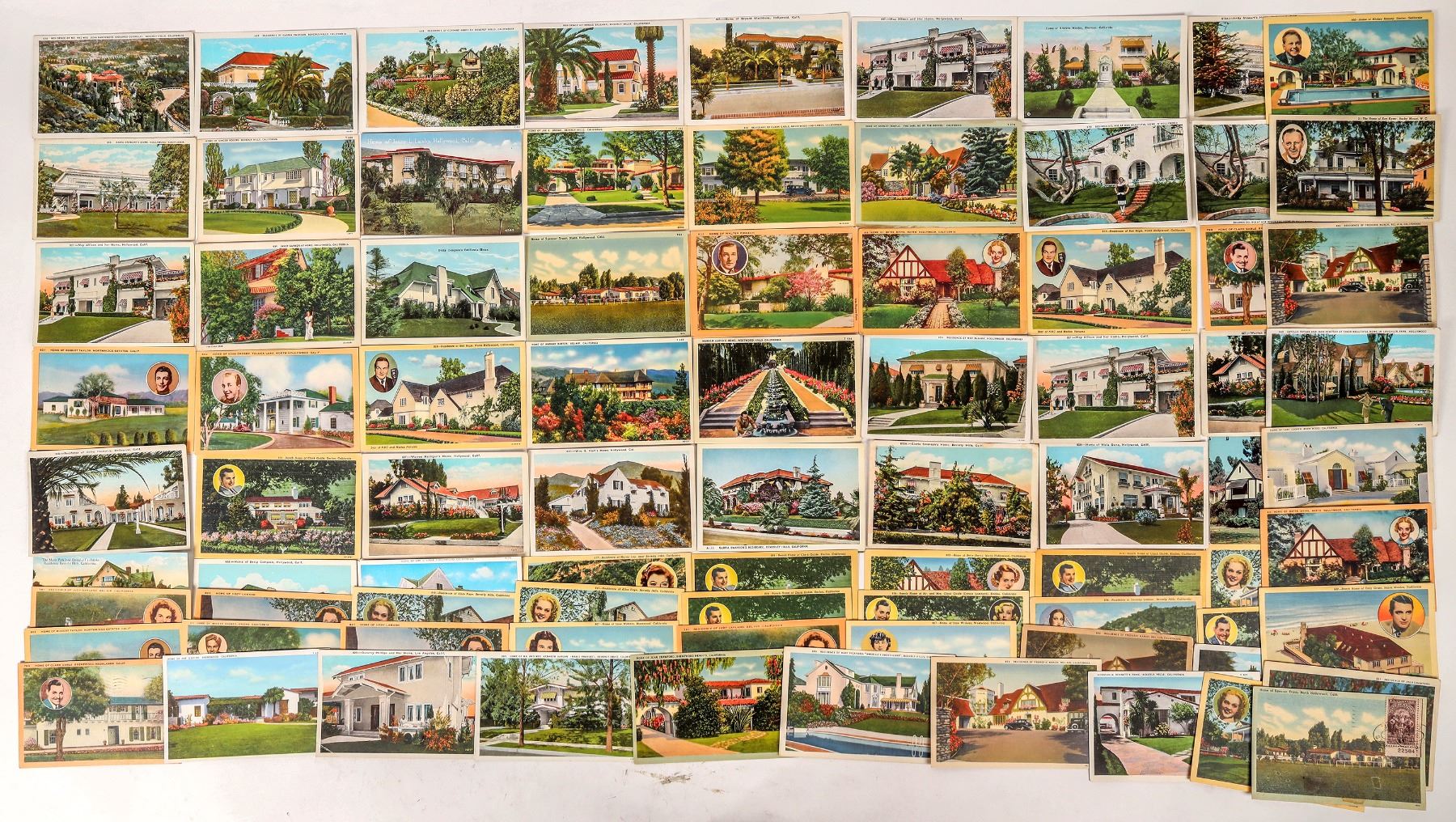 Lot of 70+. Color with white and color borders. Postmarks: Wilmington, San Pedro, L.A., San Fran, Los Angeles Arcade STA., Pasadena. One card has 3 cent Wyoming 50th ann. 1890-1040 (large and very ornate). These are all street level view, a few names: Spencer Tracy, Joan Crawford, Jack Dempsy and Estelle Taylor in front yard, Judy Garland, Myrna Loy, Gloria Swanson, Bob Hope, Clark Gable, John Barrymore and lots more. Some have the stars posing in front of homes. No protective sleeves, but are in great cond. California Hollywood 1920's-50's Ken Prag Collection