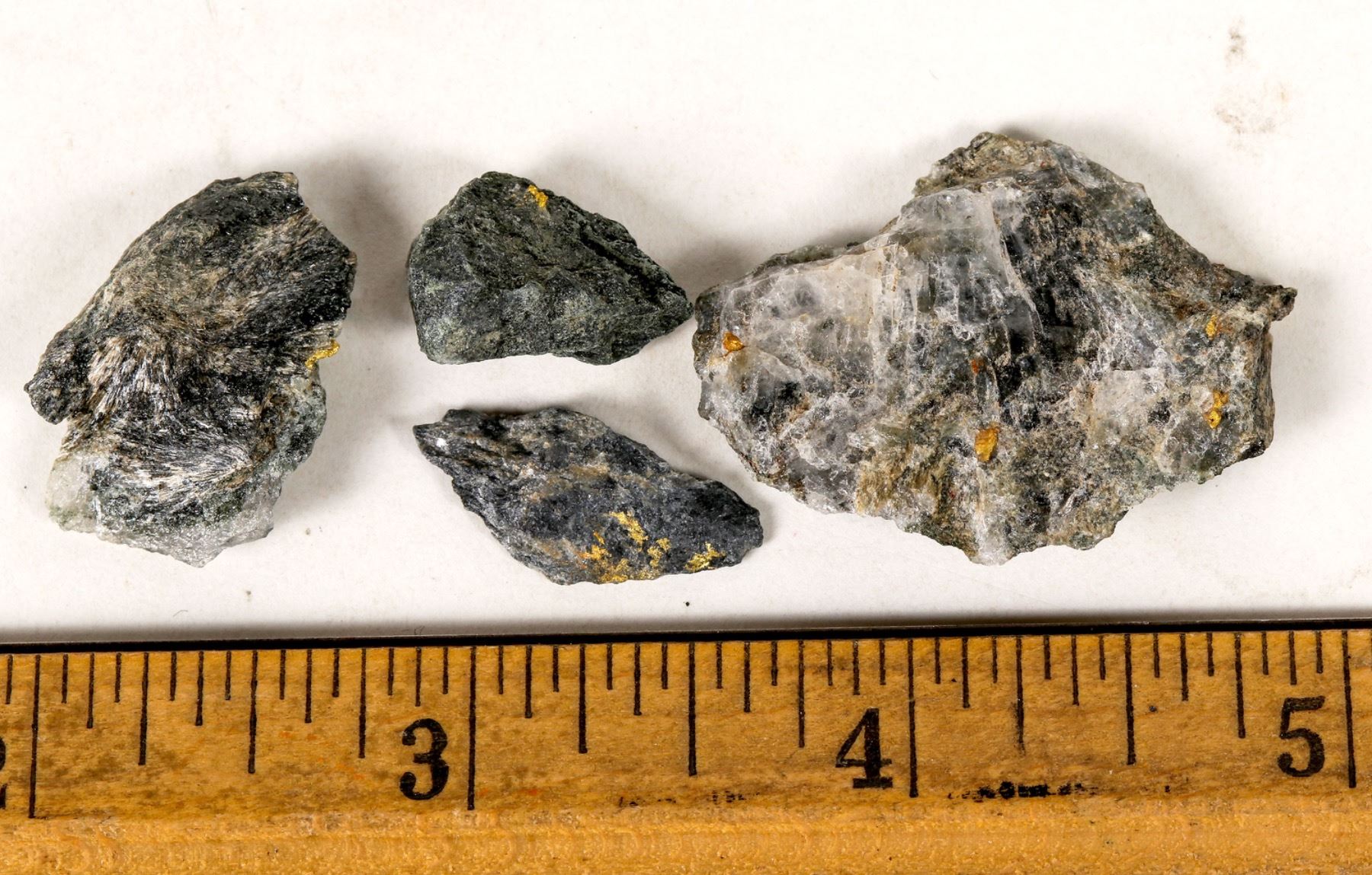 Four specimens of high grade gold ore from the Homestake Mine showing gold. Please see photos for dimensions and more details.