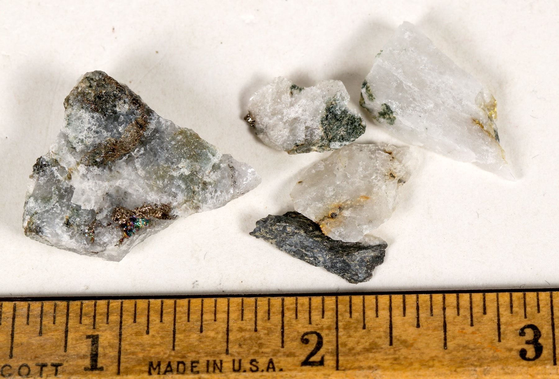 Group of four pieces of high grade from the Homestake Mine. One has nice wire gold! Please see photos for dimensions and more details.