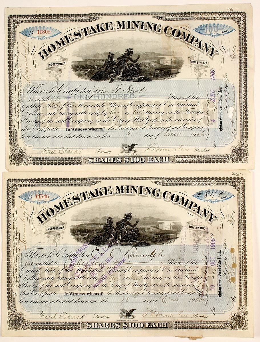 2 Stock Certs. No. 11746 for 84 shares; No. 11809 for 100 shares. Both have vignette of 2 native Americans on a perch overlooking the railroad & workers. I/punch cancelled. 10.5" x 7". Date: 1906 Location: Lead, South Dakota HWAC# 63974