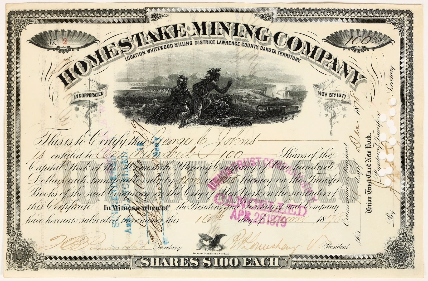 Spectacular. This is stock No. 2, found in the Homestake hoard by mining geologist Dave Shaddrick. Certificate number 1 was NOT present, which we believe makes sense if we are right that #1 was issued to George Hearst, and the Hearst family has never released any of that material. "Location, Whitewood Milling District, Lawrence County, South Dakota Territory" (printed under title). Issued for 100 shares to George C. Johns on Dec. 10th, 1878. Signed by vice president RP Lounsbery and asst. secretary Parsons. Punch and stamp cancelled. Black border and print, vignette of Native Americans looking down on railroad scene. George Hearst, Lloyd Tevis, and James Ben Ali Haggin bought the 10-acre Homestake Mine from its discoverer, Moses Manuel, for $70,000, and incorporated the Homestake Mining Company on November 5, 1877. It produced more than 40 million troy ounces of gold in its lifetime. We were not able to locate more information about George C. Johns at the time of this catalog.