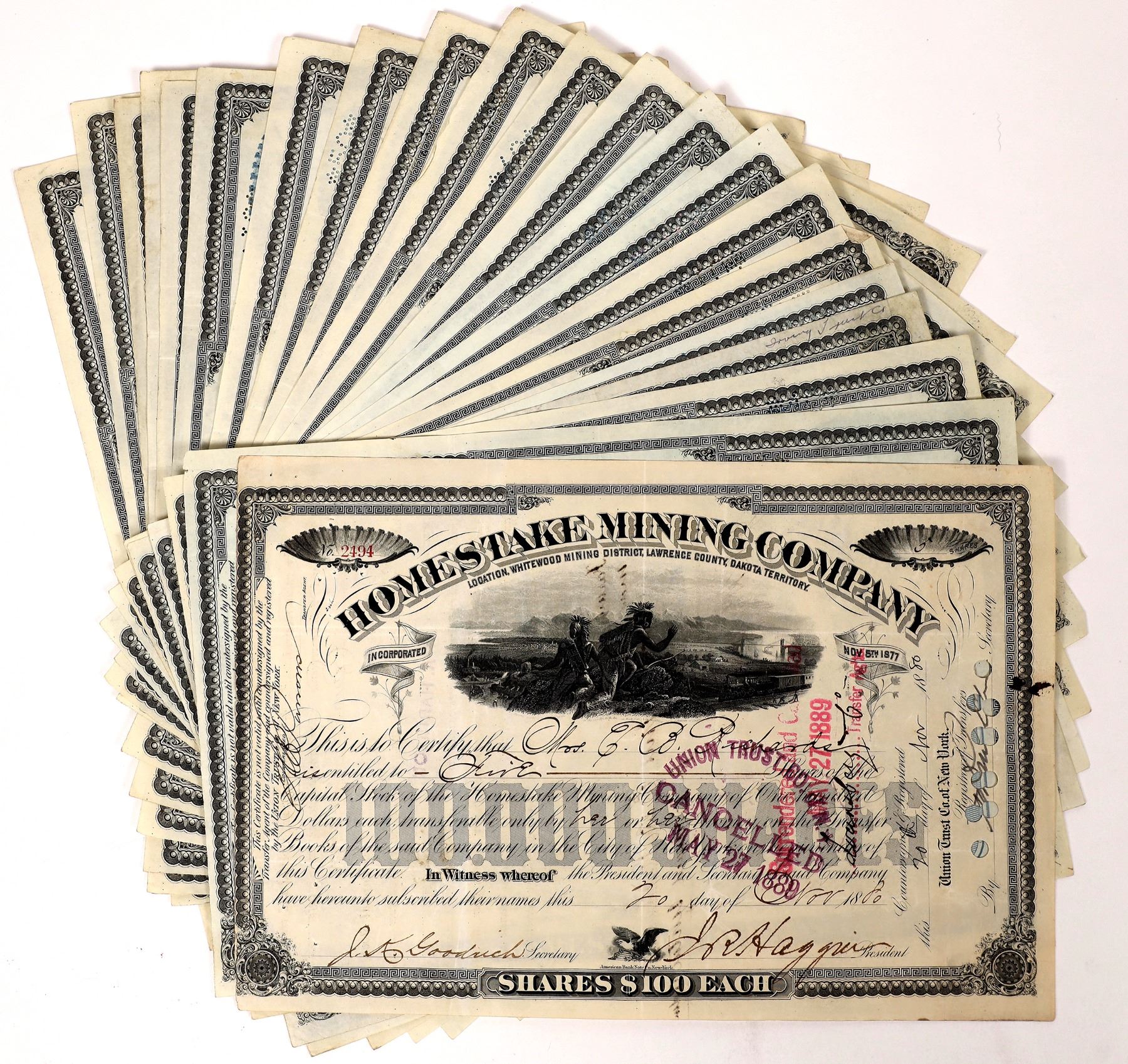 Lot of 21 stocks issued 1880-1906. Earliest piece is signed by JB Haggin, one of George Hearst's business partners, as president. Rest are 1900-06, signed by vice president Drum. All punch and stamp cancelled. Black border and print, vignette of Native Americans looking down at city. Printed by ABN. "Location: Whitewood Mining District, Lawrence County, Dakota Territory." George Hearst, Lloyd Tevis, and James Ben Ali Haggin bought the 10-acre Homestake Mine from its discoverer, Moses Manuel, for $70,000, and incorporated the Homestake Mining Company on November 5, 1877. It produced more than 40 million troy ounces of gold in its lifetime.