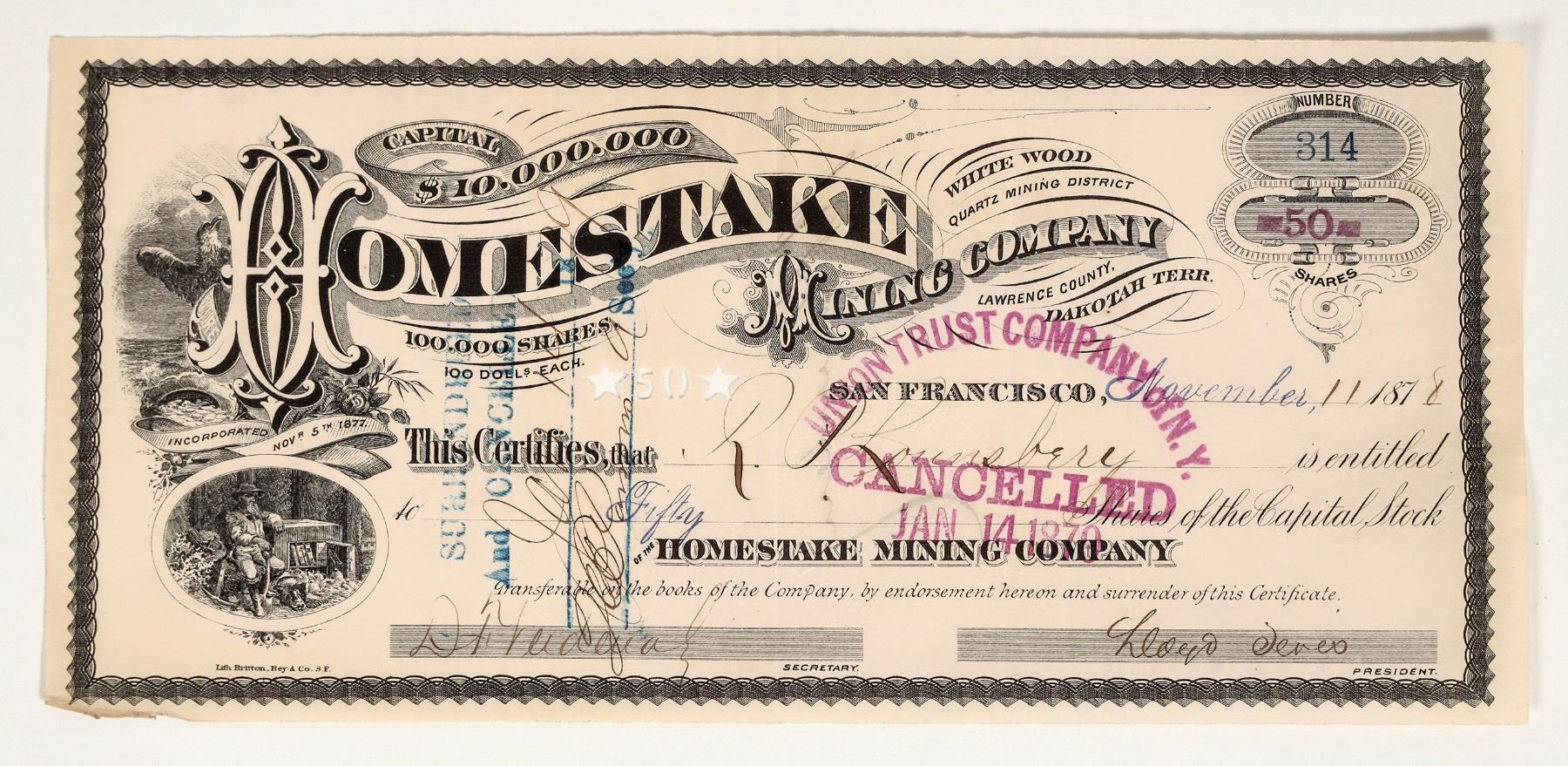 Inc. Nov. 1877. Stock no. 314, issued for 50 shares to RP Lounsbery on Nov. 11th, 1878 in San Francisco. Signed Lloyd Tevis as president and the secretary. Signed by Lounsbery on the reverse. Stamp cancelled. Ornate border and title with vignette of man next to safe. Britton & Rey. Lounsbery served as vice president and was also in charge of selling the gold in New York (see Fred's Homestake essay for more info). Lloyd Tevis (1824-1899) started the Pacific Union Express Company in 1868 along with D.O. Mills, Leland Stanford, Mark Hopkins and Charles Crocker. The company operated the route between Reno and Virginia City, Nevada, and immediately got express privileges from the Central Pacific Railroad (Loomis, Wells Fargo). In 1869, the Tevis group started accumulating shares of Wells Fargo after it had declined in price. After obtaining the controlling interest in Wells Fargo, the Pacific Union Express was consolidated into the company in 1870 (Loomis). Tevis was named president of Wells Fargo in 1872 and was president of the company for 20 years. Tevis made millions from his investments in the Homestake and along with Haggin, Hearst and Marcus Daly owned the great Anaconda mine in Montana. Tevis also had other ventures in California including the California Steam Navigation Company and the Pacific Ice Company.