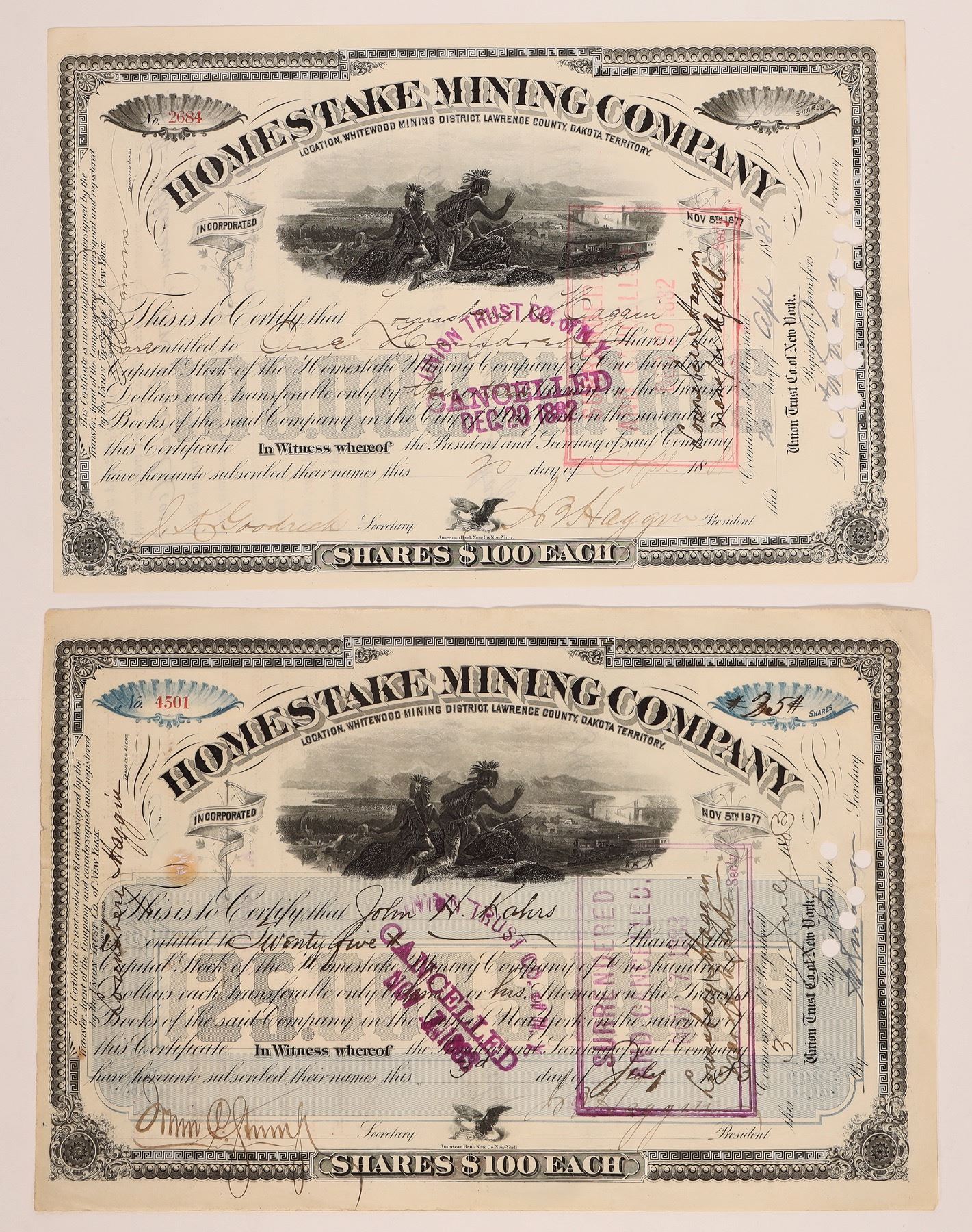 Issued 1880 and 1881 Homestake Mining with J B Haggin signatures. He was partners with Lloyd Travis and George Hearst. Hearst, Haggin, Tevis and Co. became one of the largest mining companies in the United States. 100,000 and 125,000 shares. Dakotas Ken Prag Collection