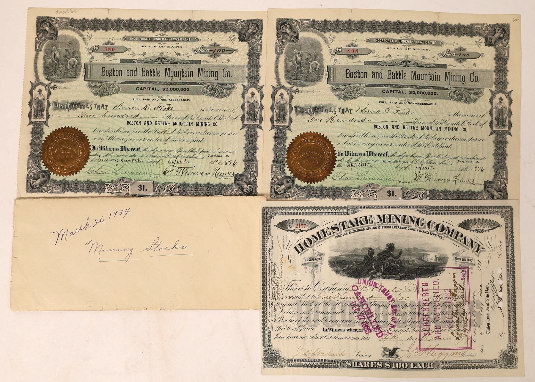 Three stock certificates: one for Homestake Mining Company, number 2157, issued 12/4/1879 to A.B. Baylis for 100 shares, signed by secy J. K. Goodrich and pres James Ben Ali Haggin, one of the four men (including George Hearst) who purchased the Homestake claim from its discoverer, Moses Manuel, in 1877; also two stock certificates, No. 380 and No. 408, for the Boston and Battle Mountain Mining Co, both issued in 1896 to Anna E. Fiske for 100 shares each. Signed by secy Chas Lawrence and pres F Warren Hawes. Lot also includes a 1924 letter from Wells Fargo Bank & Union Trust Co requesting acknowledgement of receipt of various shares of stocks as listed.