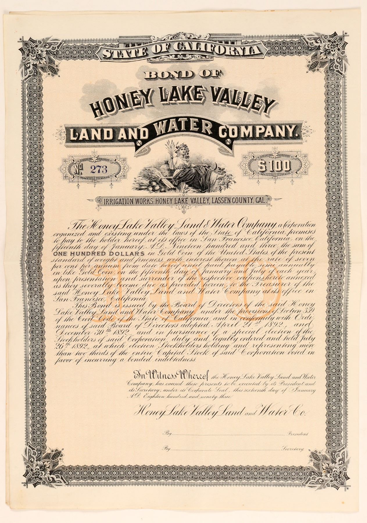 Unissued $100 bond No. 273. Irrigation Works: Honey Lake Valley, Lassen County, Cal. (printed under vignette). January 16th, 1893. Not signed. All 20 coupons still attached. Black floral border and allegorical vignette. 15.5 x 11" Fold, light foxing. The company proposed to build a dam where Long Valley Creek enters Honey Lake Valley to store water and then conduct the water through a system of canals north, covering land near Liegen, and northerly to Amadee. The drainage area of the creek above the dam is 400 square miles. Dam capacity is estimated to be 10 billion gallons. [Ref:Report on Agriculture by Irrigation in the Western Part of the United States, 1894] Ken Prag Collection