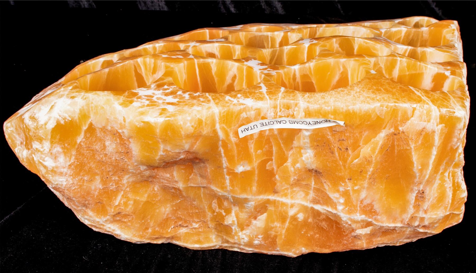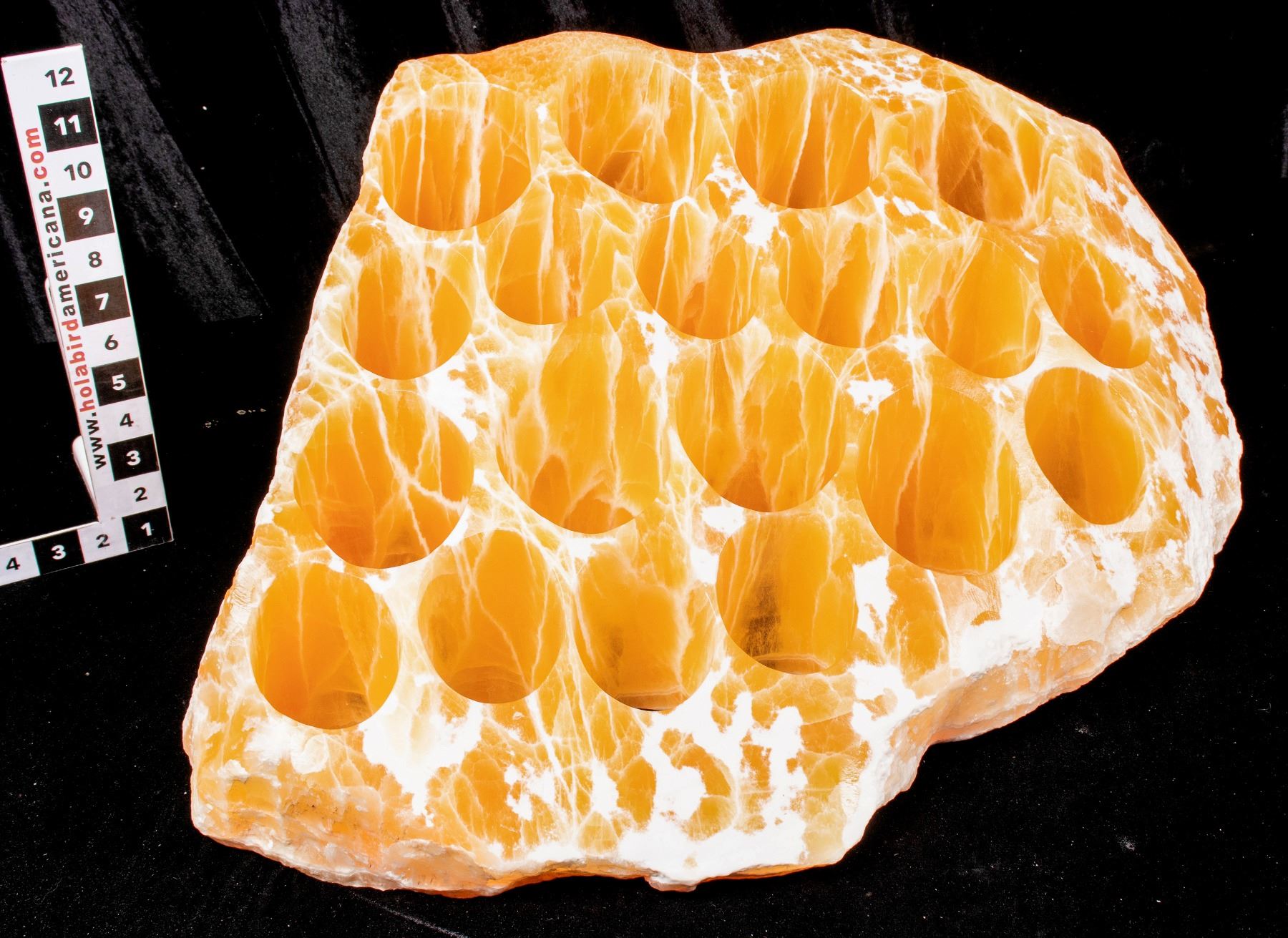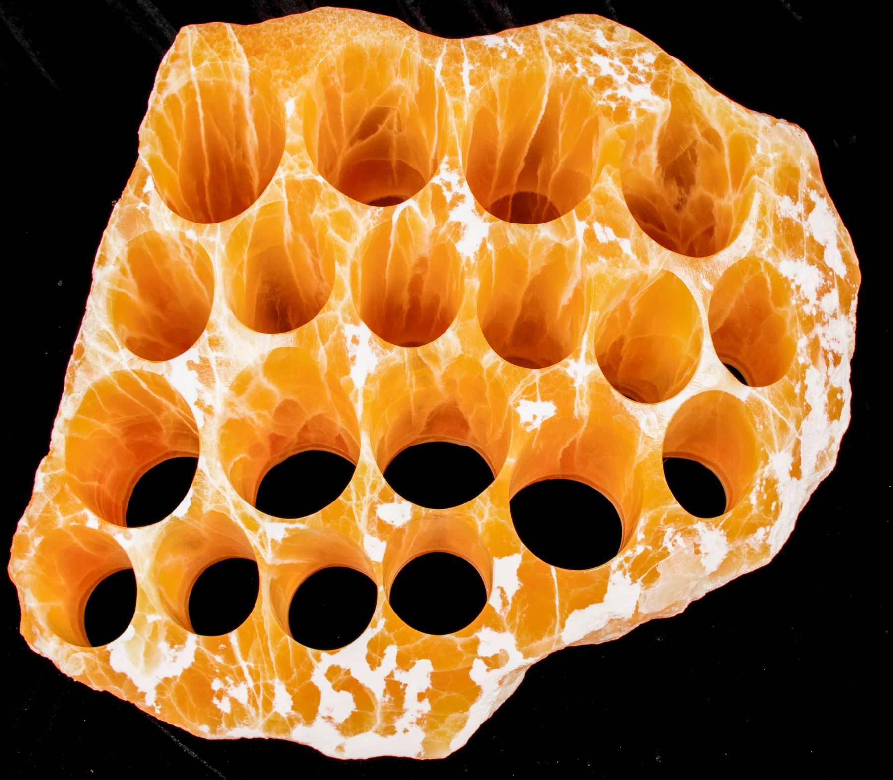 Chunk of orange/white calcite which has been cored with 2.5- and 3.5-inch cores which were (probably) later shaped to make calcite spheres. This is what is left over. Might make a good rolled map storage device or votive candle holder. State:Utah City: Date: Provenance: Chunlin Zhu Collection