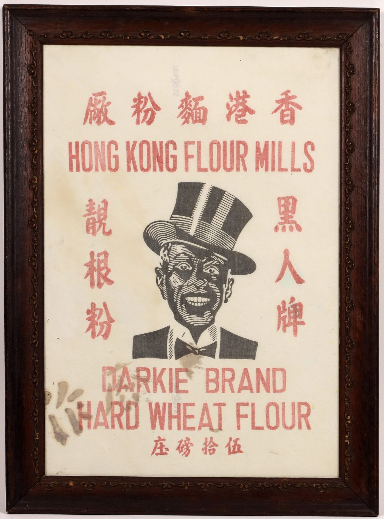 Framed Hong Kong Flour Mills Darkie Brand Hard Wheat Flour sack. Sack 21.5x14.5", frame 25.5x18.5"