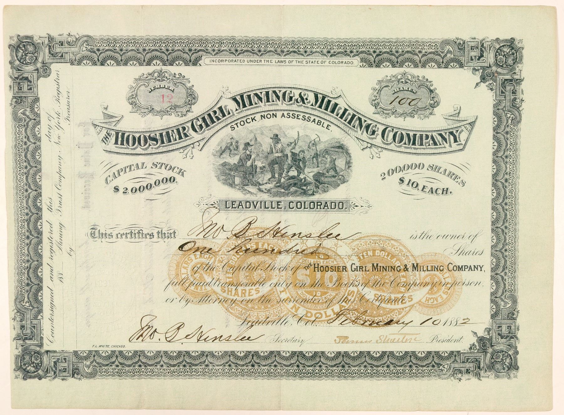 Leadville, Colorado (printed under vignette). Inc. in Colorado. Low number 12, issued for 100 shares to company secretary Jno. B. Henslee on Feb. 10, 1882 in Leadville. Signed by Henslee and the company president. Not cancelled. Printed on light green paper with a vignette of miners working on the surface and an RN facsimile underprint. Printed by F.L. Waite, Chicago. 8.25 x 11.25" Deep folds. Not listed in the 1883 CO Mining Directory, although the Hoosier Boy is described as being on Carbonate Hill, California District, located in 1879. An article from the Leadville Daily Herald (Dec. 14th, 1882) mentions a patent has been applied for this company for the Hoosier Girl and Sonora Lodes in the California District. () Ken Prag Collection