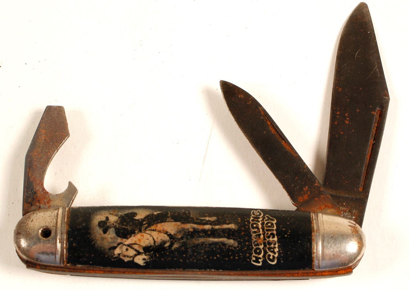 Black side panels with Hopalong Cassidy on a white horse holding up a pistol.3 blades, 3.5". HWAC# 61855 Date: Location: