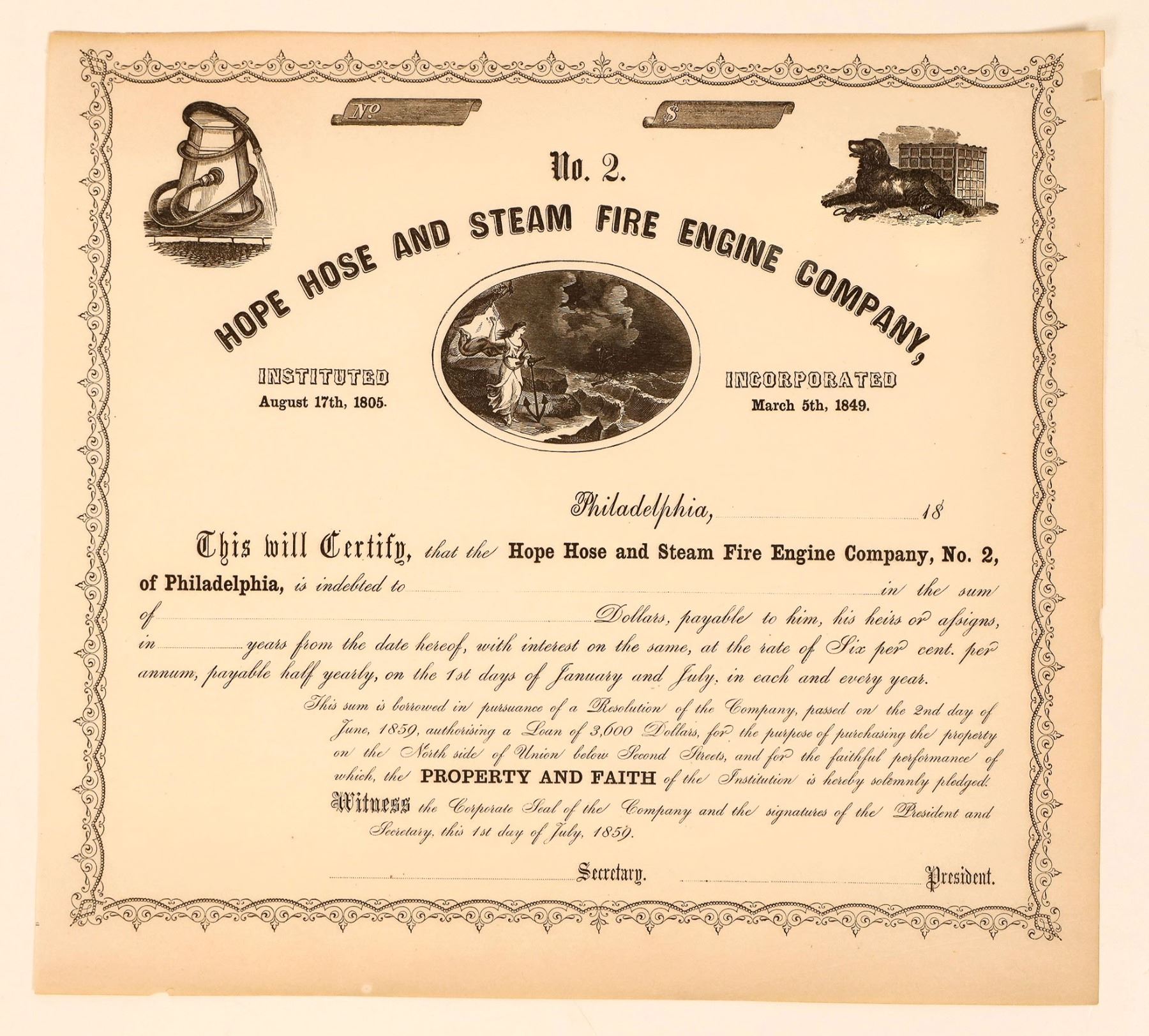 Unissued 1859 Hope Hose and Steam Fire Engine Co. stock. VF condition with hose pump vignette.