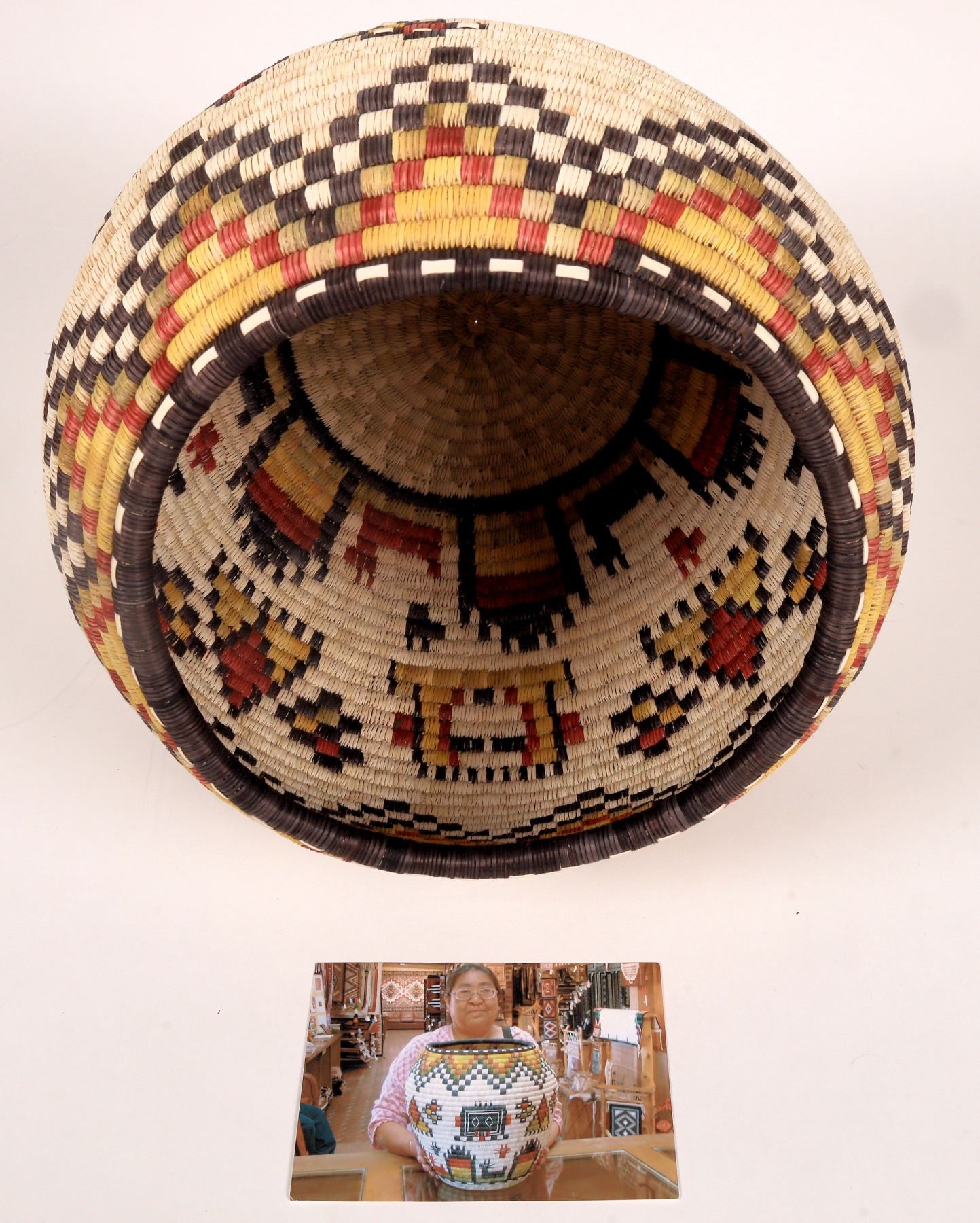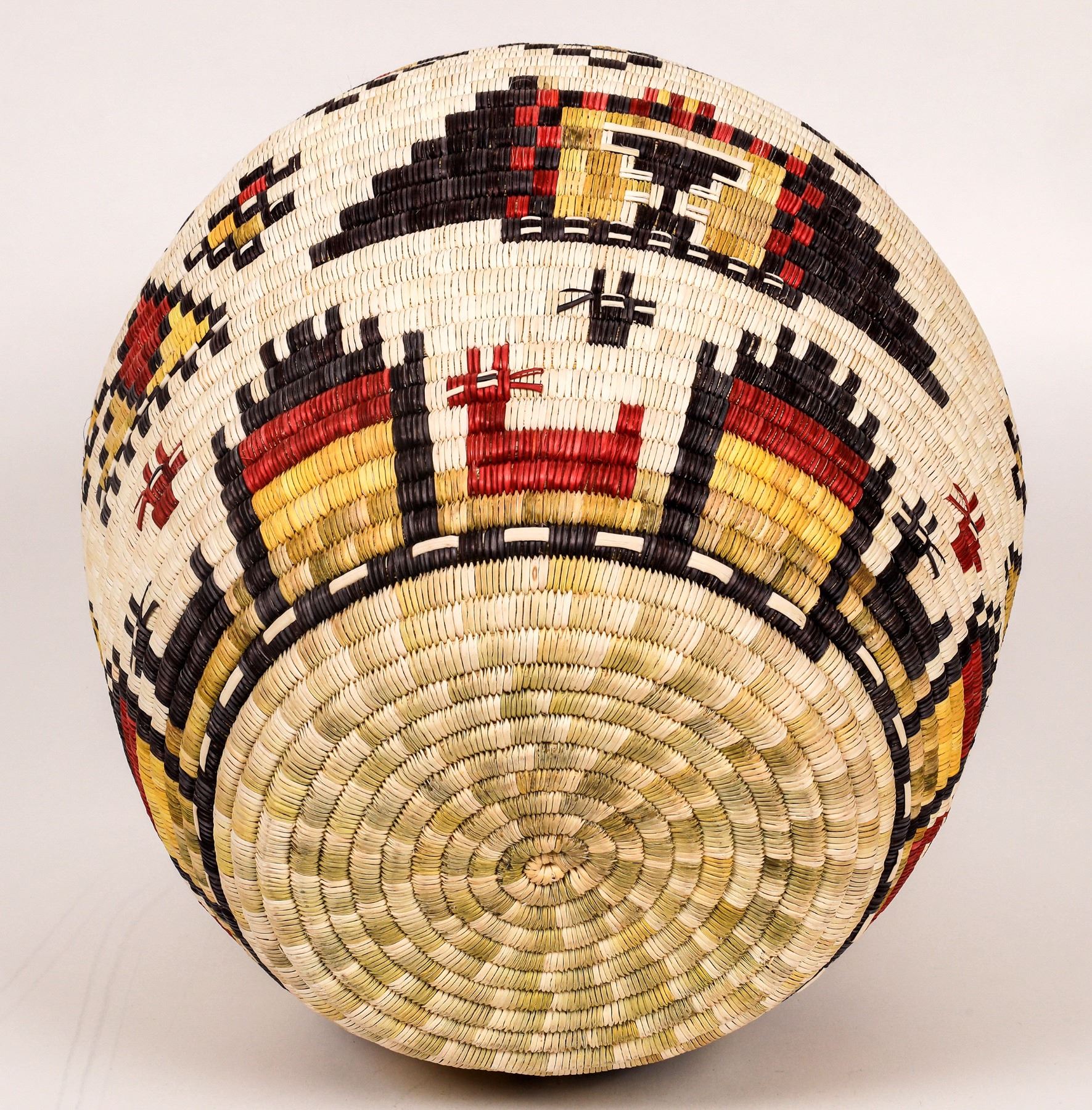 Polychrome basket by Annette Nasafotie (member of the Women's Society at Second Mesa where Hopi coiled baskets are made exclusively). Cloud designs at the top, kachina faces in the middle, bird, deer and mountains at the bottom. 13" tall 14" diameter