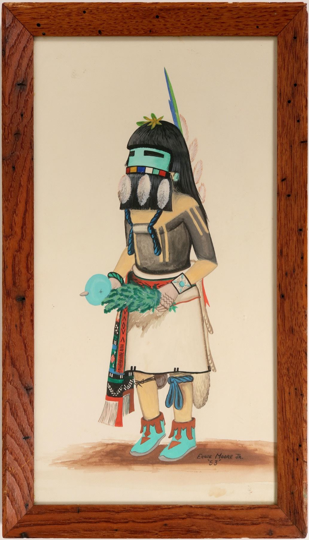 10.5 x 18.5" original watercolor by Ernie Moore Jr. Framed in Tucson, Signed and dated 1953 in bottom right. Award winning Hopi Artist.