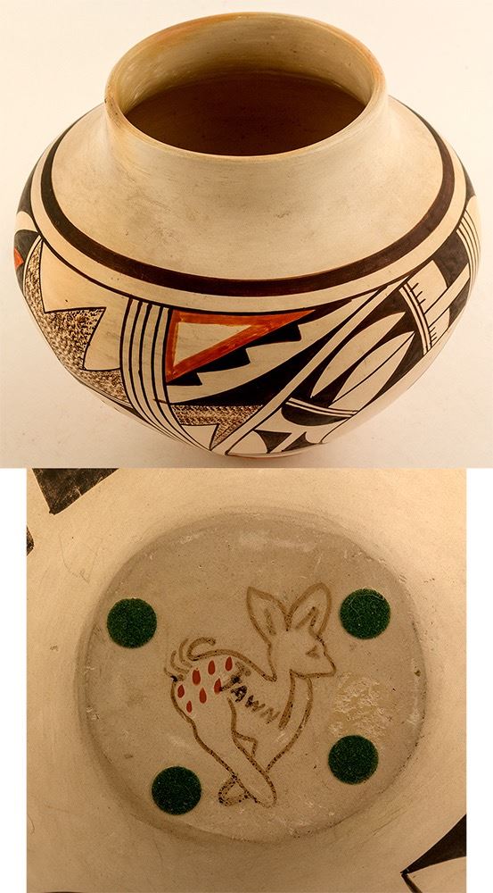Jar by Eunice Navasie (Fawn, 1920-1992), Hopi Pueblo. 7.5" h x 8" diameter. This jar is slipped in white clay, as is traditional with the Navasie family of potters. Over the polished white slip, a series of four panels of decoration each feature Sikyatki-style stylized birds. There is stippling in each panel which appears to represent bird feathers. The curved beak of each bird is painted brown and the body of the bird is painted in orange slip. She was the mother of Dolly Joe Navasie White Swann and Fawn Garcia Navasie (Little Fawn or Fawn), both of whom are outstanding potters. The jar is in very good condition. It is signed with the potter’s fawn hallmark. State:Arizona City:Hopi Date: ID# 49755