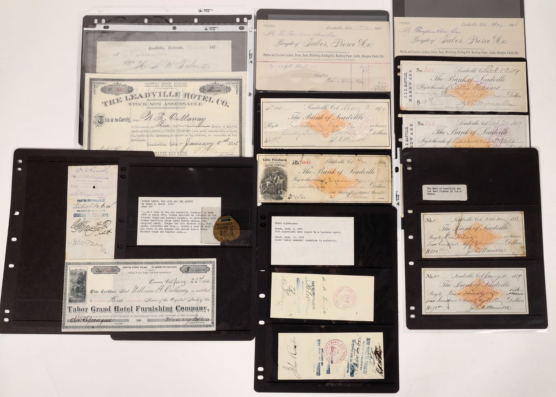 4) Ten revenue checks incl. Tabor autographs. a) Two 1878 checks from The Miners' Exchange Bank. One is signed on the back by HAW Tabor (signature smeared). The other is signed for Tabor. c) 1878 Lake County Bank check signed by Tabor on reverse. c) Seven Bank of Leadville checks, five different types. This bank was founded by Tabor. Includes two checks from JSD Manville, Hardware, and a pictorial check for the Little Pittsburg Mining Company (where Tabor made his first fortune). 1878-79, no Tabor autographs.