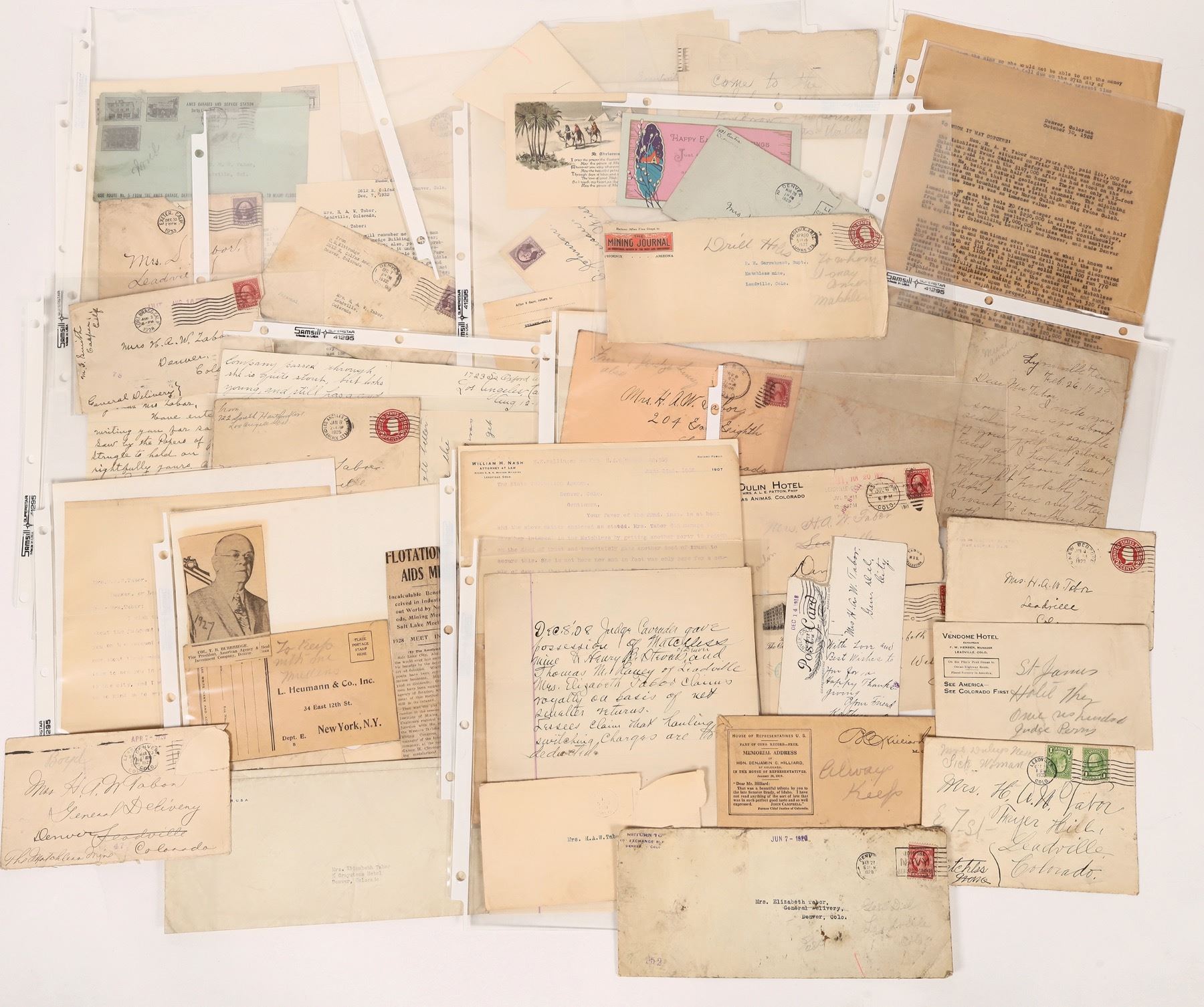 2) Personal and business correspondence to Baby Doe. Covers and letters. Some have small handwritten notes in pencil from Baby Doe. Approximately 50 items. Includes: 1908/09 and 1925 correspondence related to her ownership of the Matchless Mine; covers addressed to her, mostly from the 1920s and 30s; Easter card and cover from her daughter Lily; letters from friends; 1932 letter advising her to file a lawsuit against Warner Brothers for "Silver Dollar"; 1934 letter from a woman whose father worked for Horace and Baby Doe; 1929 letter from someone wanting a sample of silver ore from the mine; a typed 1928 letter detailing the struggles of the Matchless Mine and looking for a loan, possibly signed by Baby Doe; and more. Please inspect.