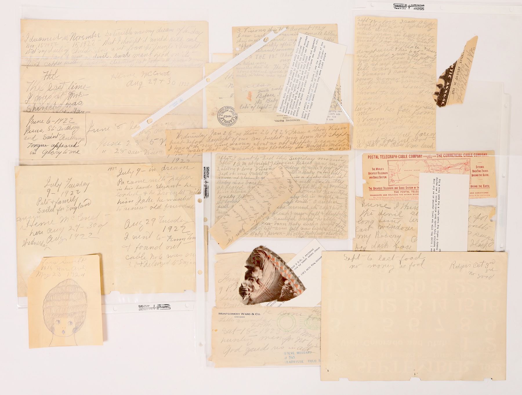 e) Five 1922 calendar pages with messages written in pencil on the reverse. Longest reads: "i dreamed this November. So terrible was my dream of to-day Nov. 15, 1922...that I thought it would kill me that my darling Child Silver went down the Jungle & brought up her hand & arm a devil-snake mans head on its thick copper seething sissing steaming hot body all pores & steam coming out of each pore his head was too horrifying murderously horrible. he was over coming her she was fainting & as white as snow...God of Everlasting mercy you are the only mercy there ever was or is save my Silver & Lily & her poor children..." Others: "Sept 6. Last food. no money or food." "July 9. in dream Pa came with paper in his hands elegant he looked & he brought with him Jake he wanted to renew old friendship." "June 6 1922, Jesus, St. Anthony and Saint Anthonys tongue appeared in glory to me. 5 visions. saw vision of No. 17."