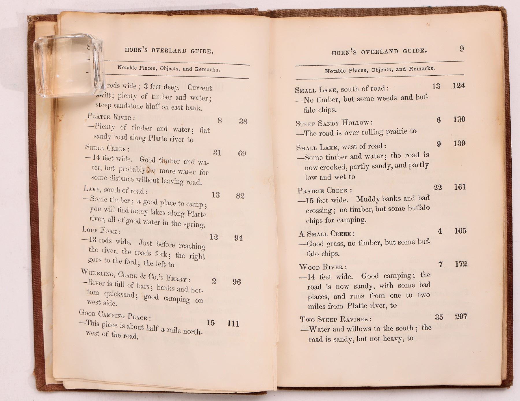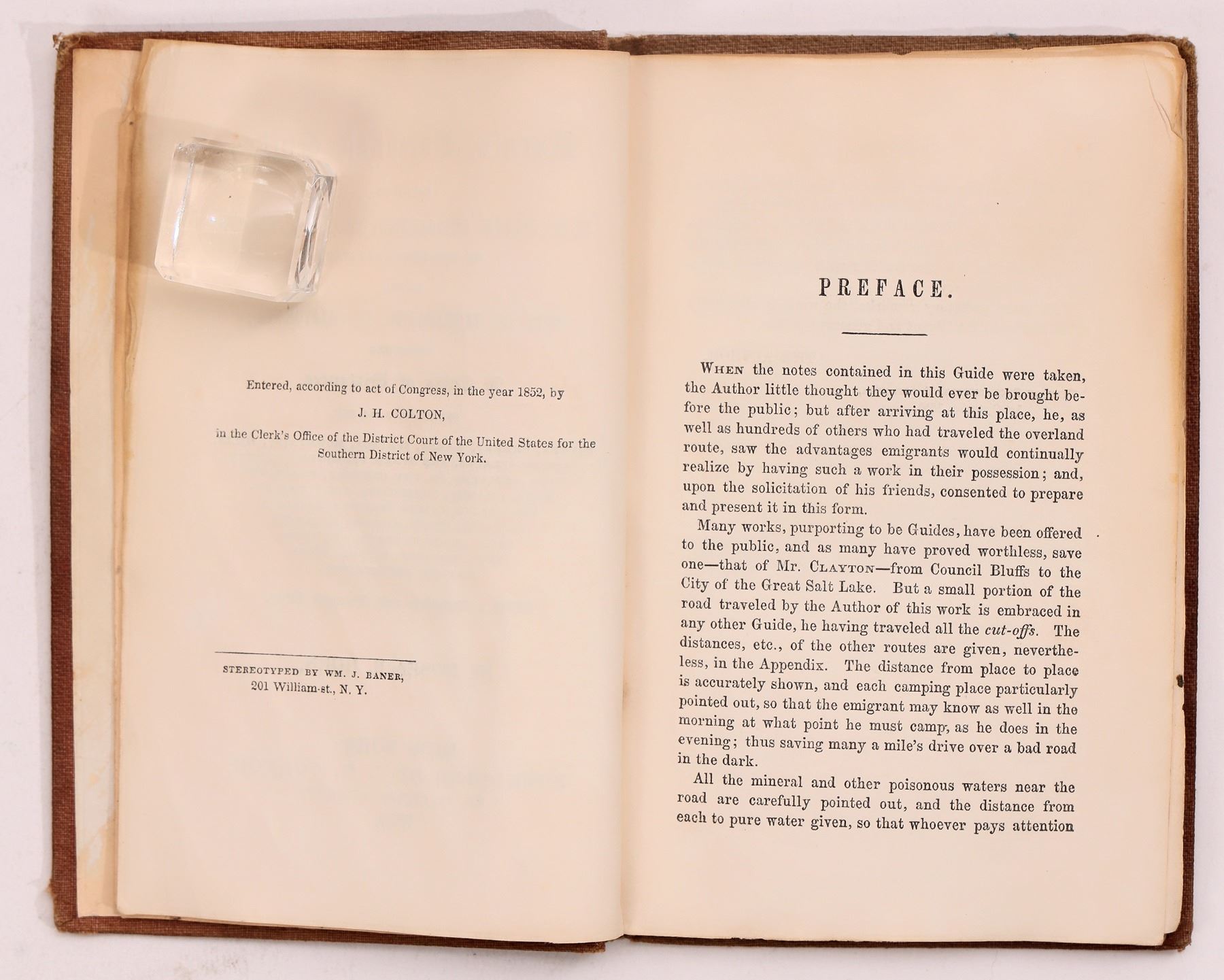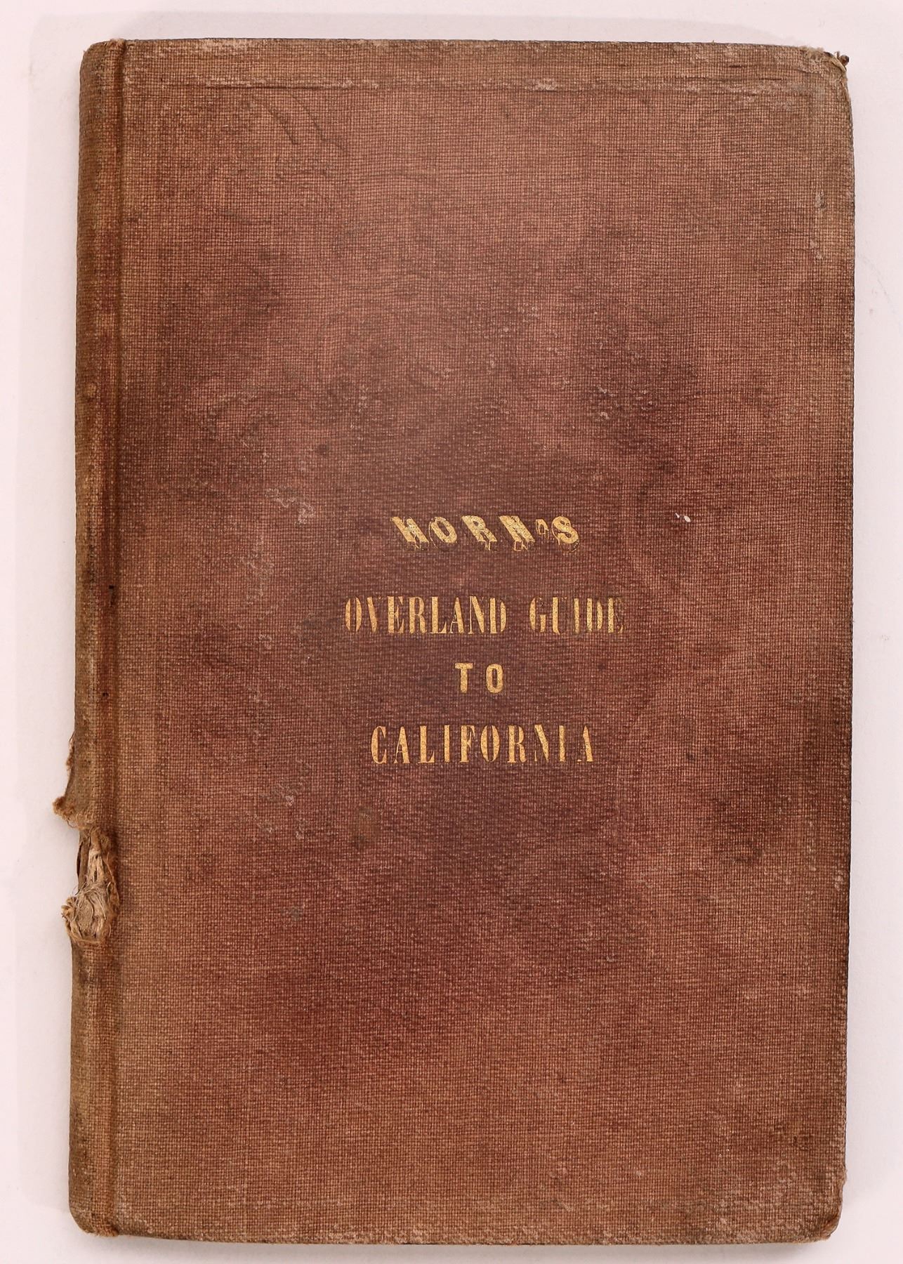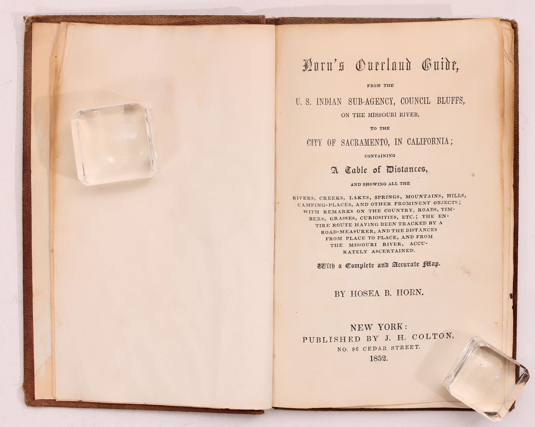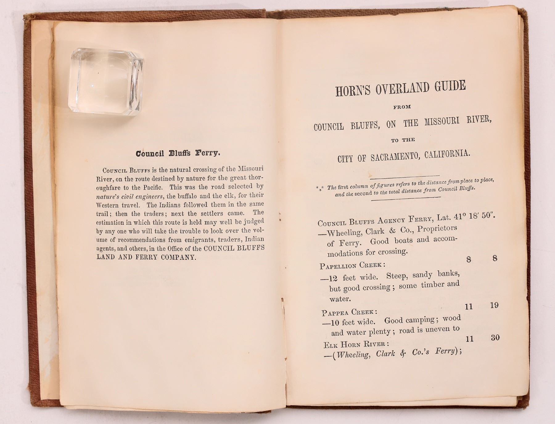 1st edition. From the U.S. Indian Sub-Agency, Council Bluffs, on the Missouri River to the City of Sacramento, California. Contains a Table of Distance and showing all of the rivers, creeks, lakes springs, mountains, hills, camping places and so much more. By Hosea B. Horn, published by J.H. Colton, 1852. 78 + 18 pages of ads. The foremost guide in 1852 for traveling west on the Transcontinental Railroad. Not in Zamorano 80. Number 343a in Kurutz. Front inscription is presented by M H Clark, a Boston doctor. Presented to J V C Smith, MD. No map. Small section of spine missing, some board warp and fade, page water stains mostly in second half. Please inspect.