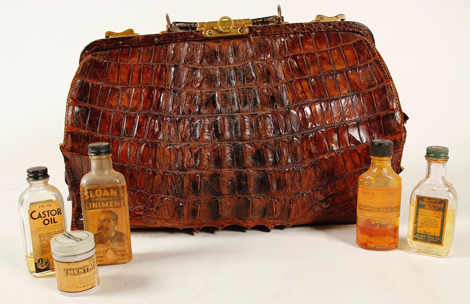 Antique / early vintage Alligator Gladstone satchel travel bag, Edwardian - 1920s. Possibly a doctor's bag-some bottles inside, 10" x 16" x 7.5". This particular Gladstone would have been one of the more expensive available back in the day, as it features the wonderful raised hornback alligator skin on both the front and back, as well as both sides/ends. The matching skin covered padded handle, nice brass fittings, substantial frame and excellent fine smooth leather interior lining are all additional indicators of fine, high quality craftsmanship. Cracks and tears on ends.The hard red interior leather remains quite nice, with no rips or tears and still feels soft and smooth, like kid, or similar high quality. It is quite clean with no significant stains, HWAC# 57842 Date: c.1920's Location: