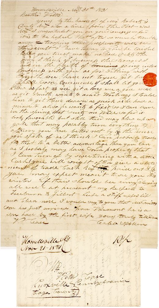 A caring datelined letter (Nov. 30, 1831) from Caleb (last name?) possibly to his brother saying to be careful who he trusts and wishing him prosperity and speaks about business.