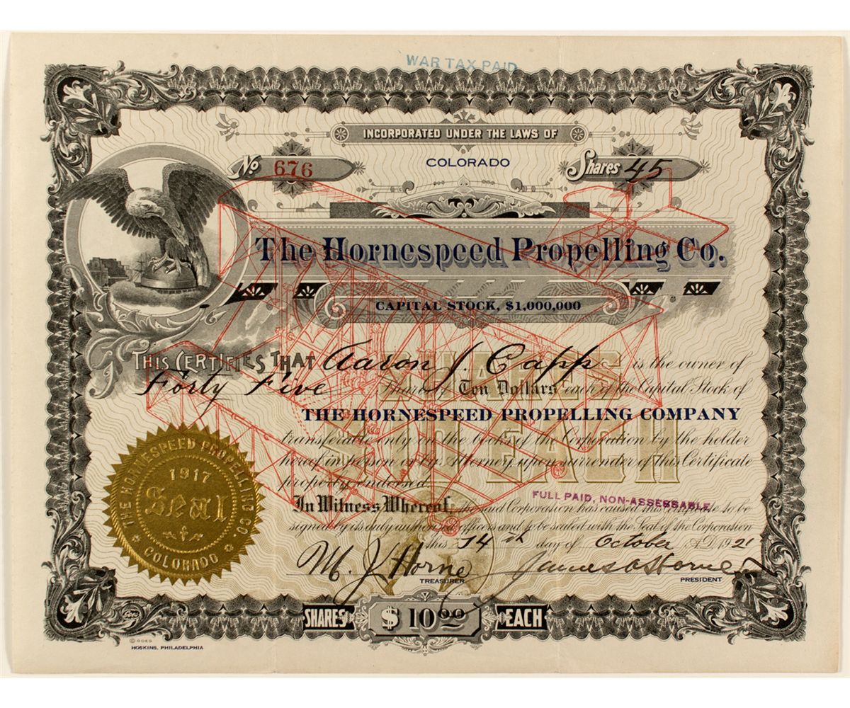 Inc. in Colorado but based in Buffalo, New York. No. 676, issued for 45 shares to Aaron J. Capp on Oct. 14th, 1921. Signed by James Horne (president) and W. J. Horne (treasurer). Eagle vignette upper left. Large, early aviation pictorial in red in the center of the stock. Looks like a Wright Bros. plane. Folds, otherwise very nice condition. According to The Iron Age (Oct. 11, 1917), the company "will manufacture airplanes under the Hornespeed patents, marine propellors and ventilators and fans." Prag Collection
