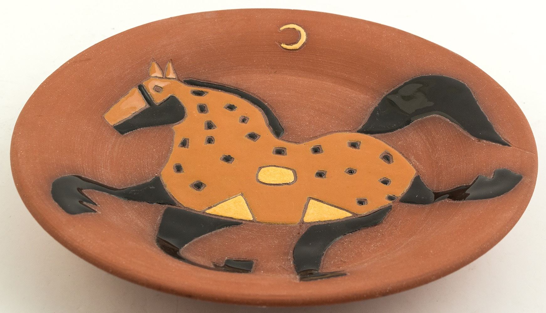 Enameled horse design on Bowl by Glen LaFontaine. 9.75" diameter. State:New Mexico City:Jemez Pueblo Date: ID# 49370
