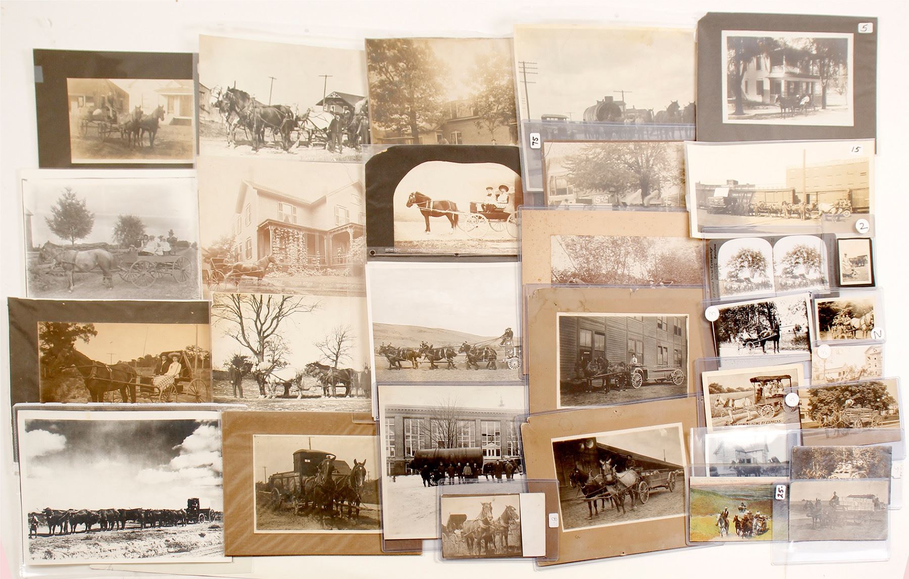 Thirty one photographs of horse drawn wagons. One stereoview card, a few real photo postcards, but mostly photographs. Date: Location: HWAC# 63638