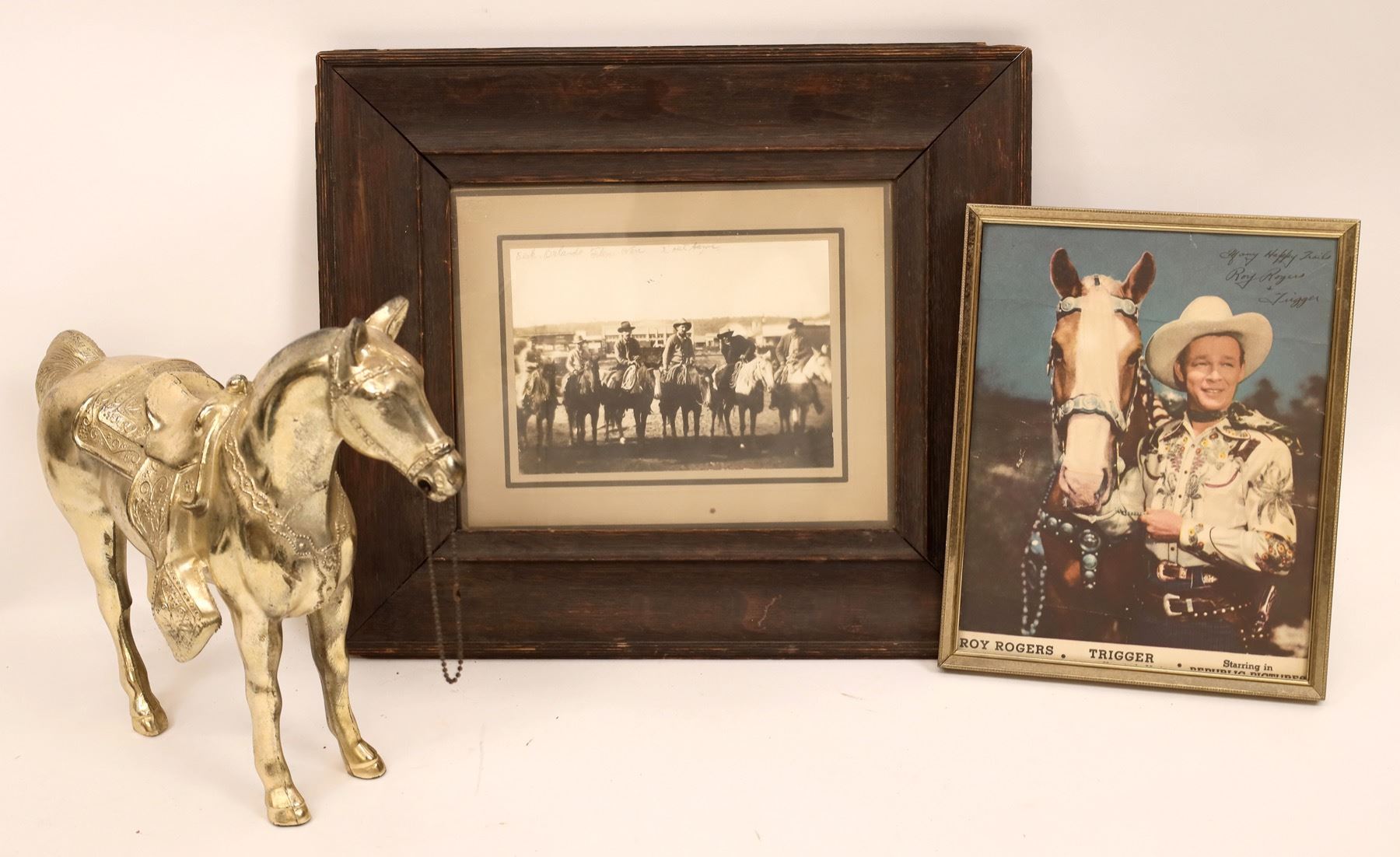 One brass horse figure, depicting a horse with a classic saddle. Autographed photo of Roy Rogers, standing adjacent to his horse. One additional Western photo depicting six men and boys on horses, posing for photo.