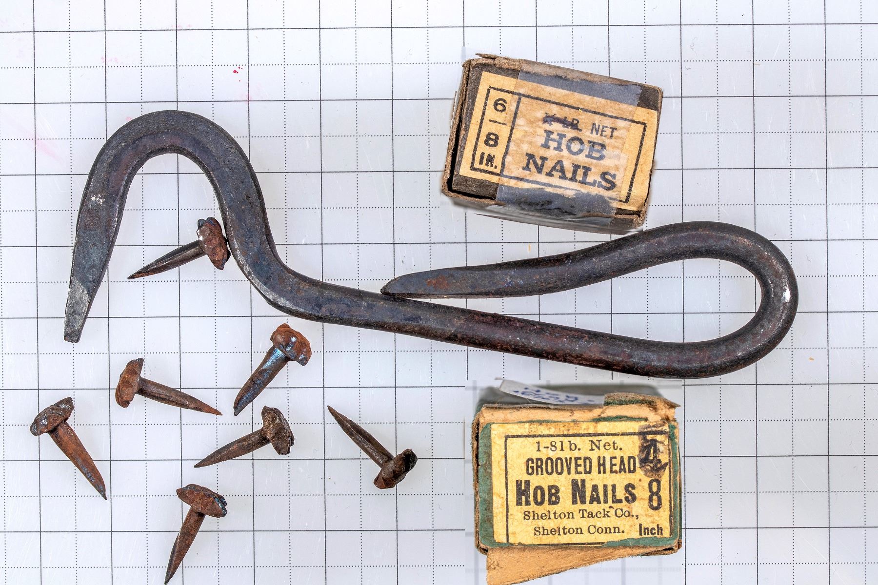 This lot includes one horse hoof pick and two boxes of hob nails from around the 1890s. The horse hoof pick is made of iron. This tool is used to remove mud, stones, and dirt from horses' hooves. Hob nails are inserted into boot soles to improve their durability. Good condition.