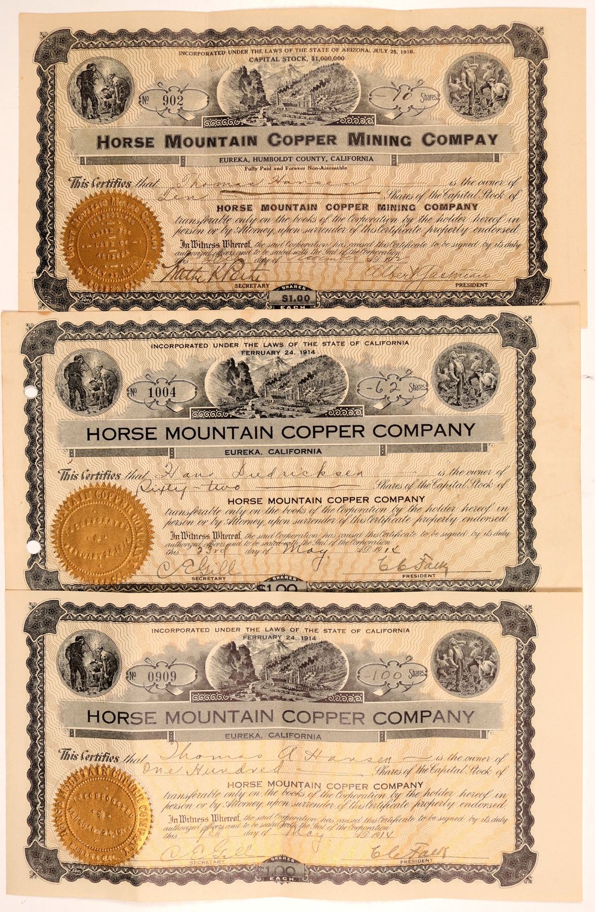 Lot of 3, two varieties. Mine location printed on certificates: Eureka, California. Inc. in California, 1910 and 1914. Issued in 1912 (10 shares) and two in 1914 (62 and 100 shares). One is punch cancelled. Black border and print, gold seal, three mining vignettes. Folds, very good. Two are signed by president CC Falk and one is signed by president Albert Gastman. According to Mines and Mineral Resources of Del Norte County, Humboldt County, Mendocino County, 1915, the Horse Mountain Copper Company had 10 groups of claims (70 total). A wagon road runs from the mine 25 miles to a railroad connection to Eureka. There is 3000 ft. of underground development (pgs. 26-27). Ken Prag Collection