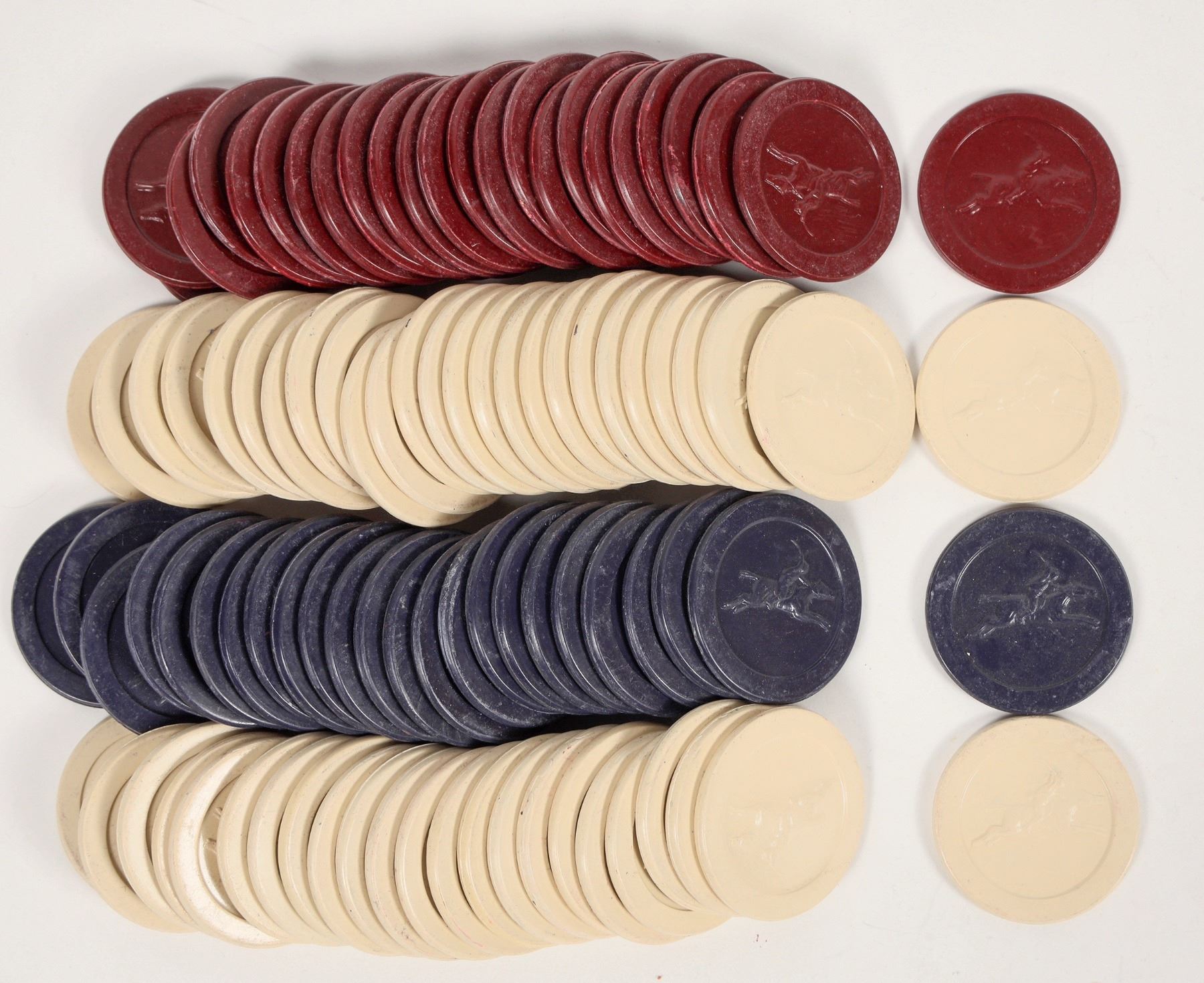 Poker chips: 24 red, 25 blue and 49 white; all with horse and rider.