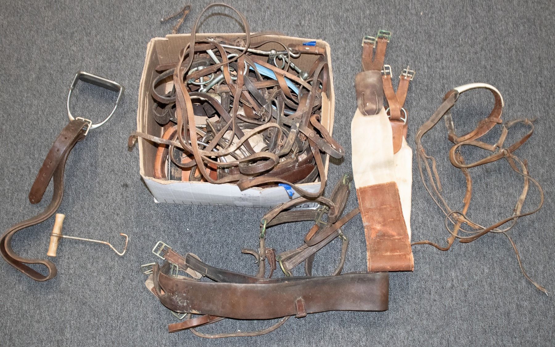 3 pair and a stray of rawhide stirrups; 2 pairs of metal stirrups; pair of English stirrups with bit; 2 bits; approx 4 leather headstalls and other leather accoutrements.