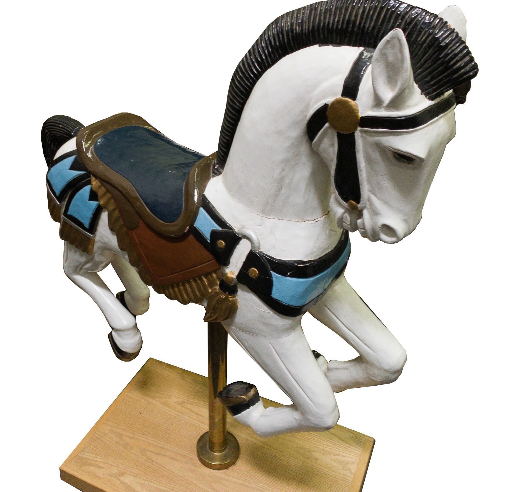 Beautiful vintage full size carousel horse. Has been refurbished/restored. Beautiful color, hand painted. Horse has expected chips & patina due to age. Has cracking in neck & tail area. Please inspect. 12" W. x 54" H. x 45" D. Horse rests on brass pedestal, on oak stand. Delightful addition to any child's room or for display. State: City: Date: early 1900's HWAC# 85807