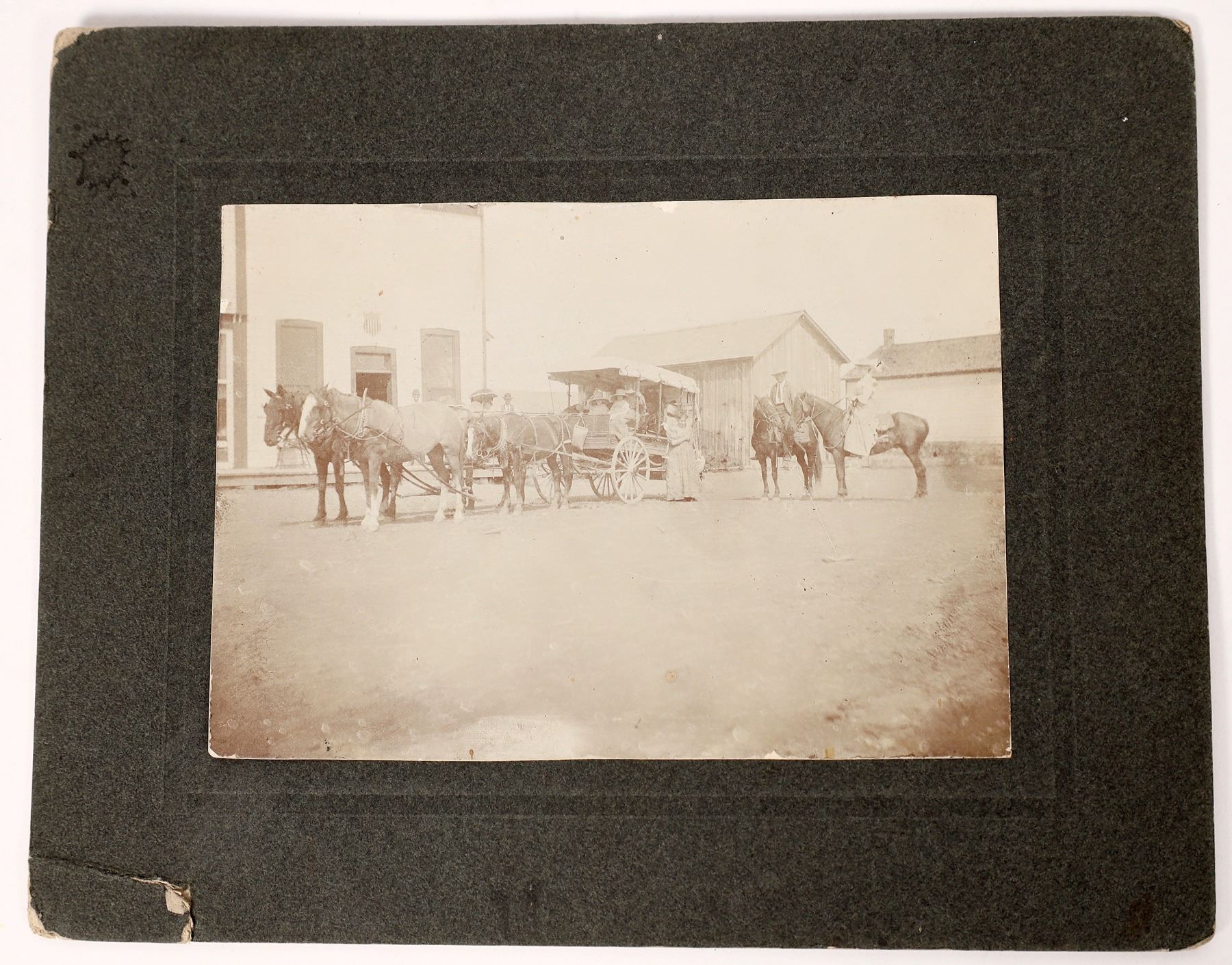 Four horse wagon and two people on horseback in this vintage photograph ascribed to Red Rock Montana. Mat is 10 x 8 inches; the photo is 6 1/2 x 5 inches. A piece of the backing cardboard is missing, lower left corner. Red Rock Montana