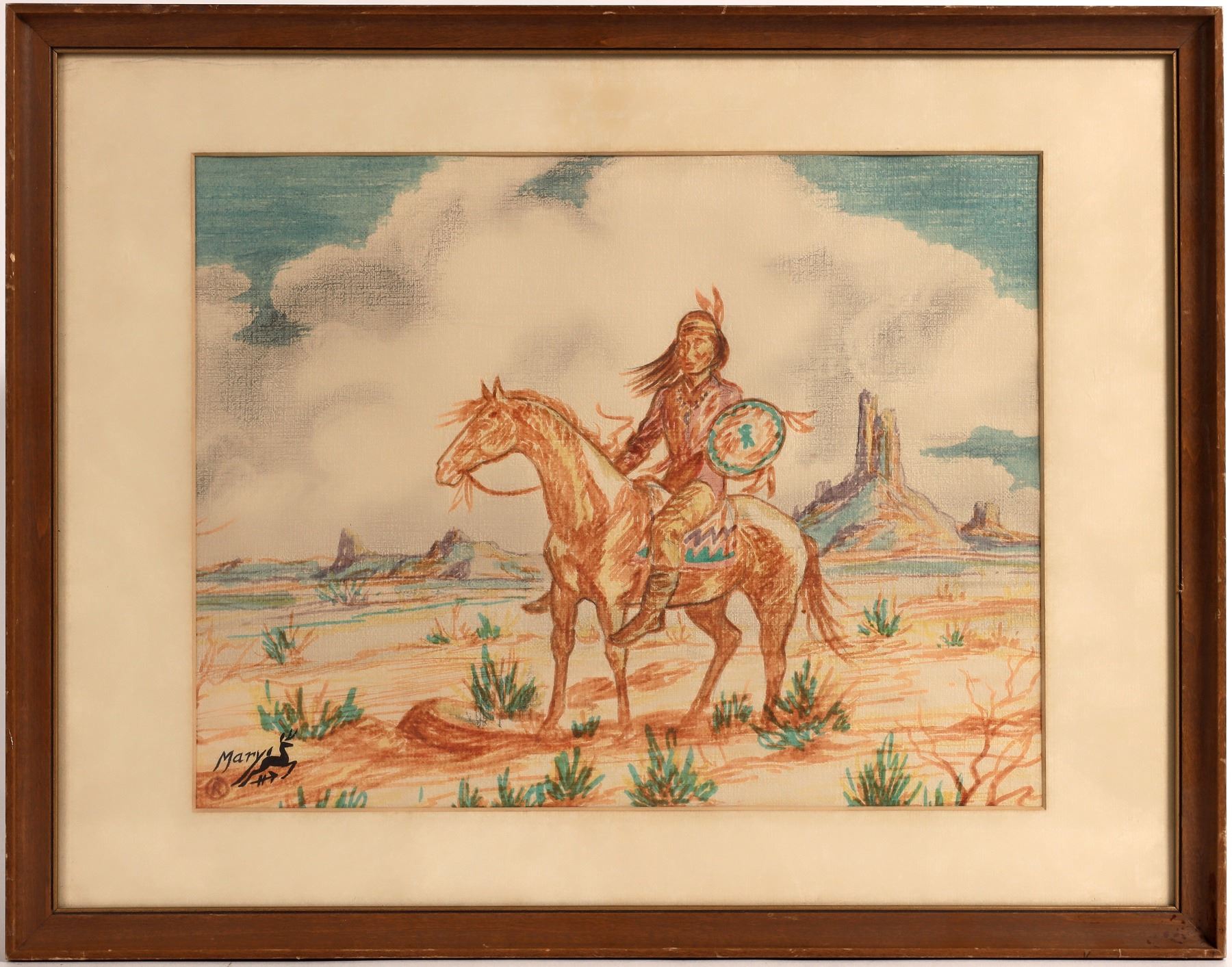 Framed drawing by Mary Running Deer, whose studio was in her home 11053 E. Tanque Verde Road, Tucson. Undated, 19 x 15 inches.
