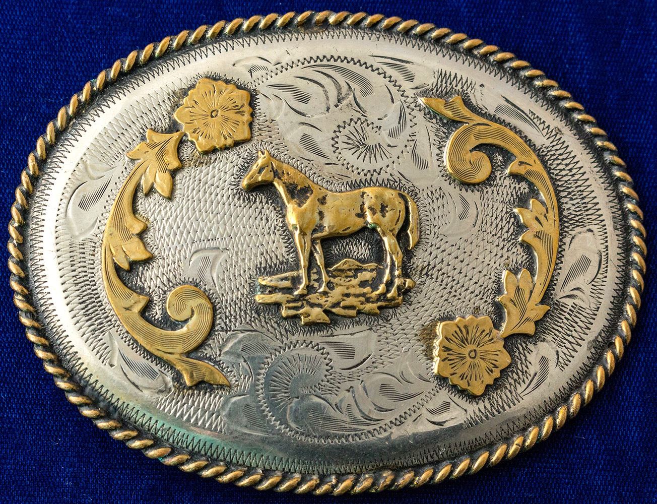 Oval shaped western belt buckle with a gold roped border (gold plated? I can see green oxidation present). Two gold floral western patterns overlay the planchet (nickle brass?) and surround a gold horse (gold plated?) standing a top a plateau. The planchet is engraved with detailed floral patterns. SIZE: 4.25" x 3.25". In excellent condition. No markings on the back except for a "JC" hand etched in. Date: Location: HWAC# 47952